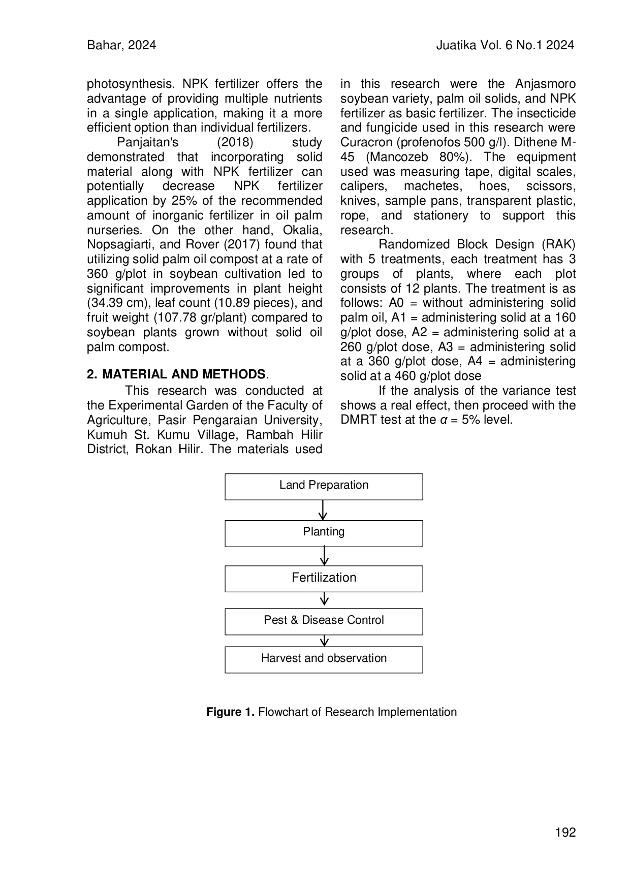 JURNAL AGRONOMI TANAMAN TROPIKA (JUATIKA)JURNAL AGRONOMI TANAMAN TROPIKA (JUATIKA)Permintaan akan kedelai di Rokan Hulu meningkat seiring dengan pertumbuhan populasi dan perluasan produk berbasis kedelai. Namun, petani lokal tidak dapat memenuhi permintaan yang meningkat ini akibat berkurangnya lahan pertanian yang layak untuk budidaya kedelai dan menurunnya tingkat kesuburan tanah. Oleh karena itu, diperlukan upaya bersama untuk meningkatkan produksi kedelai di daerah tersebut. Dipercaya bahwa penerapan minyak padat kelapa dapat meningkatkan hasil kedelai. Sebuah penelitian dilakukan untuk menyelidiki dampak berbagai dosis minyak padat kelapa terhadap pertumbuhan tanaman kedelai. Temuan studi dianalisis menggunakan uji Duncan Multiple Range (DMRT) α 5%, menunjukkan bahwa penerapan kompos padat tidak berpengaruh signifikan terhadap tinggi tanaman, diameter batang, usia bunga, atau jumlah buah. Namun, perbedaan signifikan diamati pada jumlah dan berat biji per tanaman sampel, dengan dosis optimal 360 g per plot.