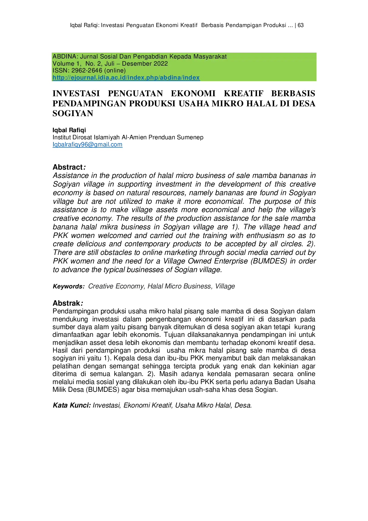 ABDINA: Jurnal Sosial dan Pengabdian kepada MasyarakatABDINA: Jurnal Sosial dan Pengabdian kepada MasyarakatPendampingan produksi usaha mikro halal pisang sale mamba di desa Sogiyan dalam mendukung investasi dalam pengenbangan ekonomi kreatif ini di dasarkan pada sumber daya alam yaitu pisang banyak ditemukan di desa sogiyan akan tetapi kurang dimanfaatkan agar lebih ekonomis. Tujuan dilaksanakannya pendampingan ini untuk menjadikan asset desa lebih ekonomis dan membantu terhadap ekonomi kreatif desa. Hasil dari pendampingan produksi usaha mikra halal pisang sale mamba di desa sogiyan ini yaitu 1). Kepala desa dan ibu-ibu PKK menyambut baik dan melaksanakan pelatihan dengan semangat sehingga tercipta produk yang enak dan kekinian agar diterima di semua kalangan. 2). Masih adanya kendala pemasaran secara online melalui media sosial yang dilakukan oleh ibu-ibu PKK serta perlu adanya Badan Usaha Milik Desa (BUMDES) agar bisa memajukan usah-saha khas desa Sogian.
