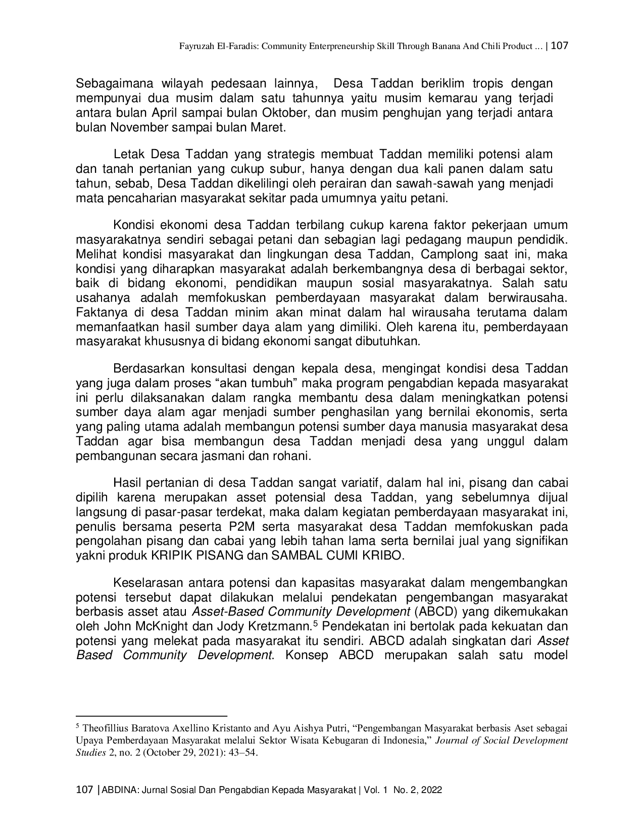 ABDINA: Jurnal Sosial dan Pengabdian kepada MasyarakatABDINA: Jurnal Sosial dan Pengabdian kepada MasyarakatCommunity entrepreneurship skill merupakan sebuah upaya dan strategi dalam menghasilkan produk berdasarkan asset yang dimiliki. Melalui hal ini, muncullah ide-ide pengolahan bahan baku menjadi barang olahan yang bernilai jual, begitu juga dengan desa Taddan yang menjadi sasaran dalam kegiatan pemberdayaan masyarakat ini. Desa Taddan dengan asset unggulannya yaitu pisang dan cabai akan meningkatkan pertumbuhan perekonian desa melalui pengolahan pisang dan cabai tersebut menjadi produk yang ekonomis dan bernilai jual. Untuk mencapai tujuan tersebut, penulis menggunakan metode Asset-Based Community Development (ABCD). Metode ini dikembangkan dari asset-aset yang dimiliki, bukan berangkat dari masalah. Dengan metode ABCD, penulis mencoba memberdayakan masyarakat pedesaan, khususnya desa Taddan dalam membuat produk olahan pisang dan cabai menjadi produk yang bernilai jual. Hasil dari kegiatan ini adalah launchingnya produk kripik pisang dan sambal cumi kribo dari olahan pisang dan cabai yang diterima dengan baik, serta telah menerima banyak pesanan dari masyarakat setempat.
