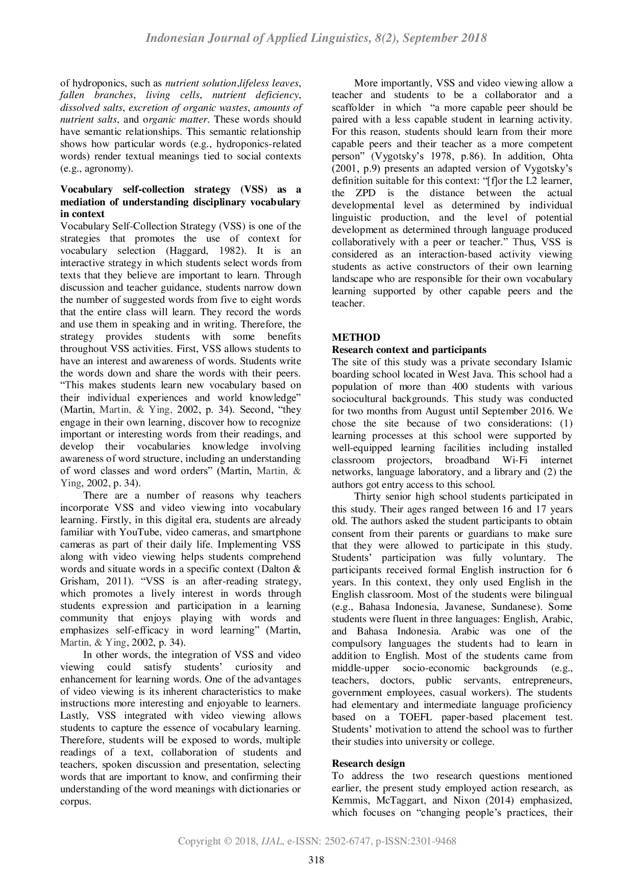 Indonesian Journal of Applied LinguisticsIndonesian Journal of Applied LinguisticsMeskipun penelitian tentang pengembangan kosa kata bahasa kedua (L2) telah banyak dilakukan, penggunaan teks video sebagai strategi untuk memahami kosa kata disiplin dalam konteks jarang dilaporkan dalam literatur. Untuk mengisi kekosongan ini, penelitian tindakan ini melaporkan temuan strategi pengumpulan kosa kata mandiri (VSS) bersama dengan penggunaan video sebagai media multi-semiotik untuk memahami kosa kata disiplin dalam pengajaran bahasa Inggris sebagai bahasa asing (EFL). Didukung oleh jurnal reflektif siswa, data observasi, dan wawancara, siswa menceritakan bahwa VSS mendorong mereka untuk belajar kosa kata disiplin dalam konteks diskursus yang berbeda. Melalui peran scaffolding oleh seorang guru dan dukungan teman sebaya, mereka terlibat dalam penemuan kosa kata dengan mendokumentasikan kata-kata yang tidak familiar atau menarik dari bacaan mereka dan dengan menjelajahi makna yang berbeda dari kosa kata menggunakan kamus elektronik dan korpus. Temuan penelitian lainnya menunjukkan bahwa siswa telah meningkatkan kesadaran mereka tentang kelas kata, urutan kata, dan makna kata. Bukti empiris ini menunjukkan bahwa VSS dapat menjadi katalis untuk melibatkan siswa dalam tugas pasca-mendengarkan seperti menulis ringkasan teks video dan membuat pemetaan atau profil kosa kata baru.