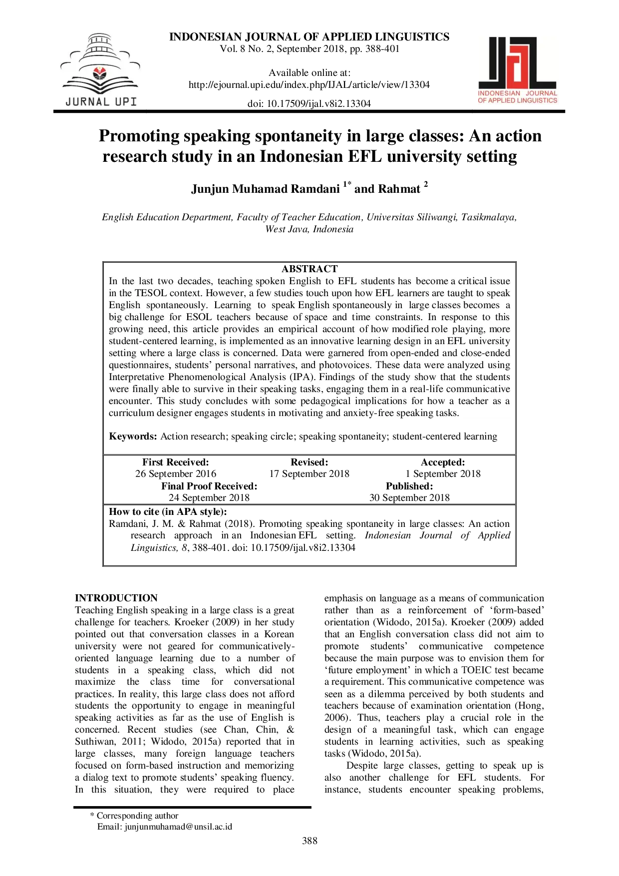 - Promoting speaking spontaneity in large classes: An action research study in an Indonesian EFLuniversity... doi.org/10.17509/ijal.v8i2.13304Promoting speaking spontaneity in large classes An action research study in an Indonesian EFLuniversity doi 10 17509 ijal v8i2 13304