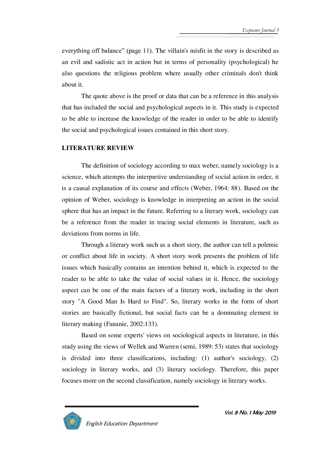 EXPOSURE : JURNAL PENDIDIKAN BAHASA INGGRISEXPOSURE : JURNAL PENDIDIKAN BAHASA INGGRISStudi ini bertujuan untuk menggambarkan masalah sosial yang terkandung dalam cerita pendek A Good Man Is Hard to Find karya Flannery OConnor. Penelitian ini bersifat kualitatif deskriptif. Sumber data diperoleh dari cerita pendek A Good Man Is Hard to Find karya Flannery OConnor. Hasil studi menunjukkan bahwa (1) ketidakseimbangan keluarga akibat kurangnya komunikasi dan hubungan sosial dalam keluarga Bailey, (2) kejahatan yang dilakukan Misfit yang keluar dari penjara dan membunuh seluruh anggota keluarga Bailey, (3) status sosial yang dijaga oleh nenek dengan sikap egois dan upaya mempertahankan pandangan masyarakat terhadapnya. Berdasarkan hasil tersebut, kesimpulan menyatakan bahwa peristiwa masalah sosial dalam cerita ini dapat menjadi pelajaran dan meningkatkan pemahaman serta interpretasi dalam berkomunikasi dan bersosialisasi dalam kehidupan. Studi ini diharapkan lebih berguna bagi pembaca buku sastra, khususnya karya Flannery OConnor dan penulis.