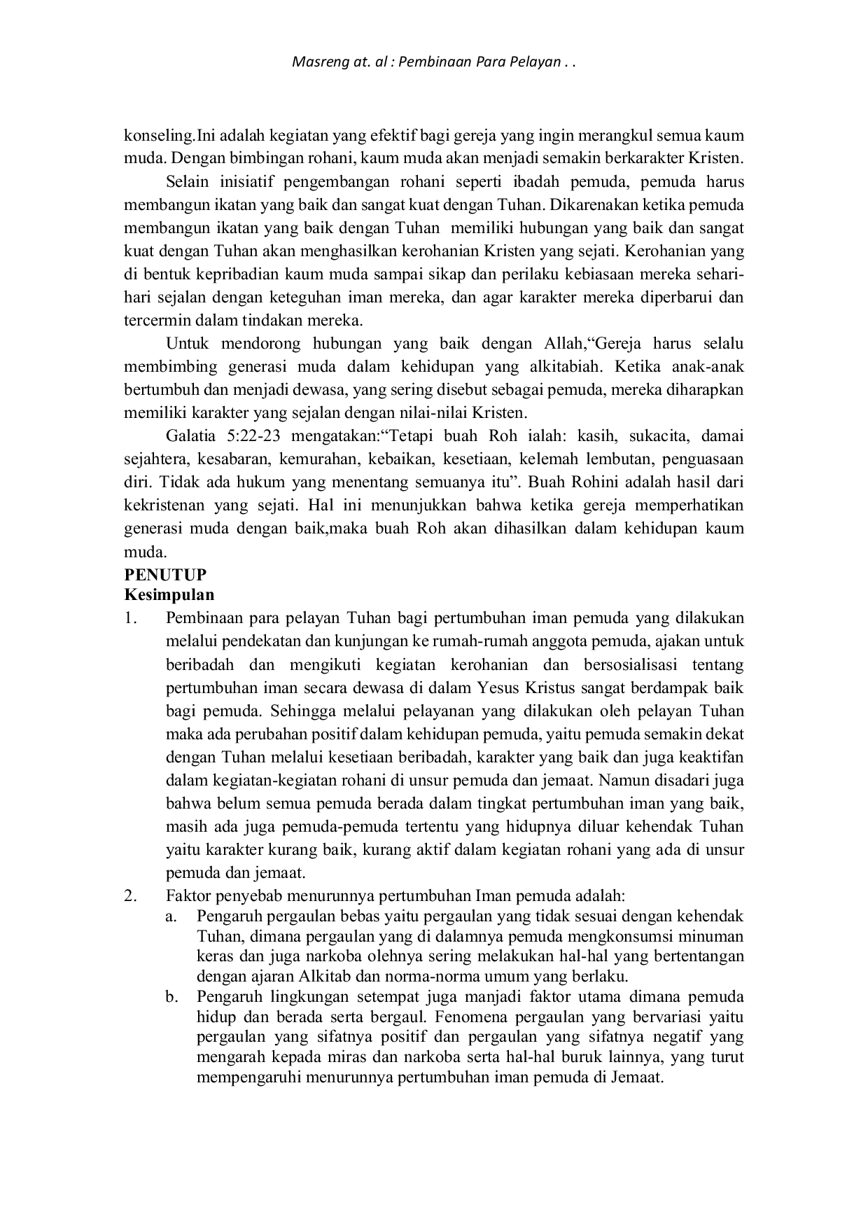 EIRENE : Jurnal Ilmiah TeologiEIRENE : Jurnal Ilmiah TeologiTujuan penelitian ini dilakukan adalah: pertama, untuk mengetahui bagaimana di Jemaat GKI Kanaan km.14. Kedua, untuk mengetahui faktor penyebab menurunnya pertumbuhan iman pemuda. Metode yang dipakai adalah yaitu metode kualitatif yaitu penelitian ini membutuhkan data berupa informasi mengenai sejauh mana peran para pelayan Tuhan terhadap pertumbuhan iman pemuda. Berdasarkan penguraian penulis dalam penelitian ini sehingga dapat disimpulkan bahwa dalam upaya terhadap pertumbuhan iman pemuda yang dilakukan oleh para pelayan Tuhan berdampak baik bagi pemuda. Hal ini dapat dirasakan oleh berbagai pihak yang terkait seperti para pelayan Tuhan maupun pemuda.