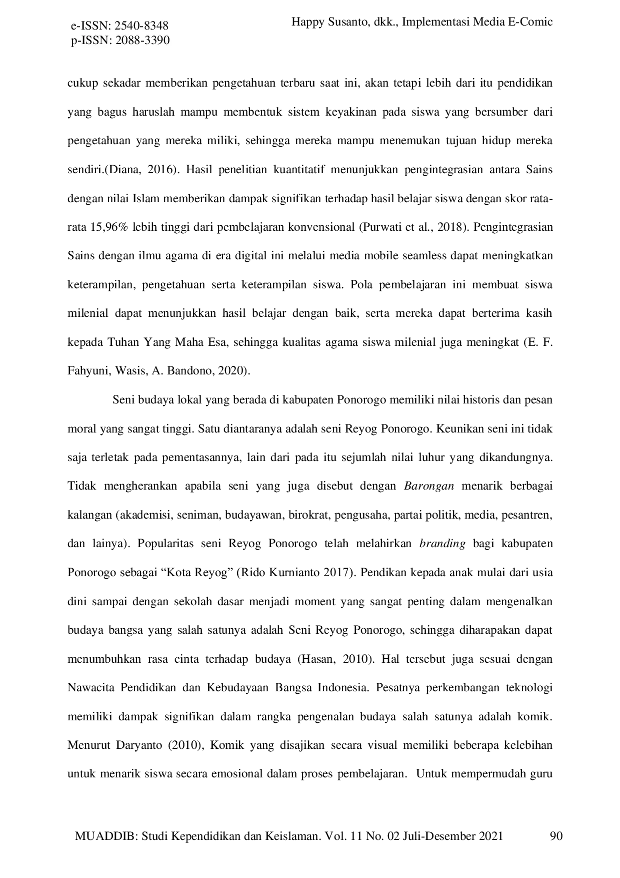 Penelitian menunjukkan bahwa media e‑comic, sebagai pengembangan komik digital, meningkatkan minat dan efektivitas pembelajaran melalui penyampaian informasi yang mudah dipahami dan menarik.Integrasi nilai sains dan Islam dalam media tersebut membantu mengembangkan pengetahuan intelektual dan religius sesuai ajaran Al‑Quran.Selain itu, e‑comic efektif melestarikan dan menyebarkan nilai‑nilai budaya Reyog Ponorogo kepada generasi muda.