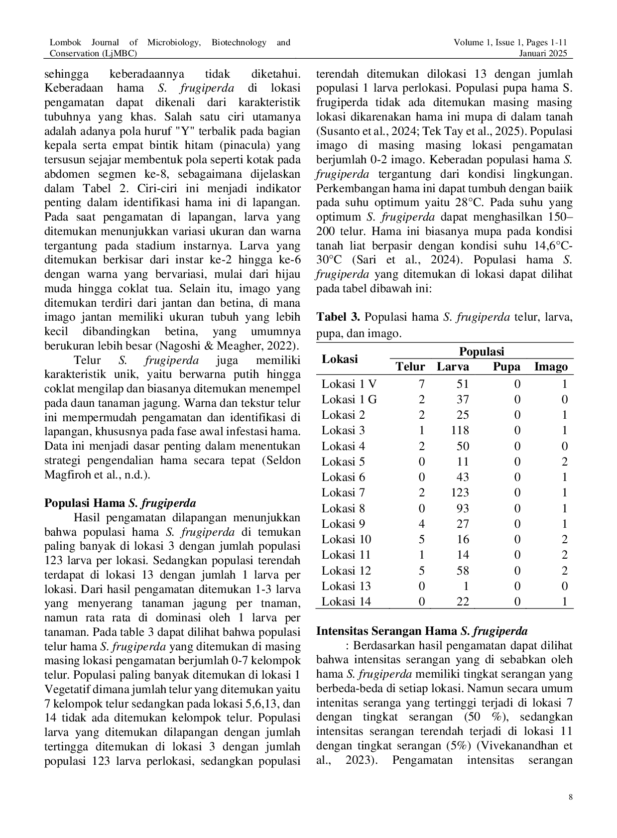 Journal of Microbiology, Biotechnology and ConservationJournal of Microbiology, Biotechnology and ConservationJagung (Zea mays L.) merupakan tanaman pangan utama di Indonesia yang rentan terhadap serangan hama Spodoptera frugiperda, serangga invasif yang menyerang tanaman jagung. Penelitian ini bertujuan untuk mengamati populasi, tingkat serangan, dan karakteristik hama S. frugiperda di Kabupaten Lombok Barat. Hasil pengamatan menunjukkan bahwa telur hama berwarna putih kecoklatan, berbentuk bulat, dengan ukuran rata-rata 0,33 mm × 0,47 mm. Pupa jantan berwarna coklat kemerahan dengan ukuran 14,25 mm × 4,32 mm, sedangkan pupa betina lebih besar yaitu 17,53 mm × 5,13 mm. Larva ditemukan dalam berbagai instar (2-6) dengan ukuran 1,53 mm hingga 35,16 mm dan variasi warna dari hijau muda hingga coklat tua. Imago jantan memiliki ukuran 12,45 mm dengan sayap 27,73 mm, sedangkan imago betina 14,38 mm dengan sayap 31,47 mm. Populasi tertinggi ditemukan di lokasi 3 dengan 123 larva, sementara serangan tertinggi terjadi di lokasi 7 (50%). Penelitian ini merekomendasikan penelitian lanjutan untuk memahami distribusi dan mekanisme pengendalian S. frugiperda guna mengurangi dampaknya terhadap pertanian jagung di Nusa Tenggara Barat, Indonesia.