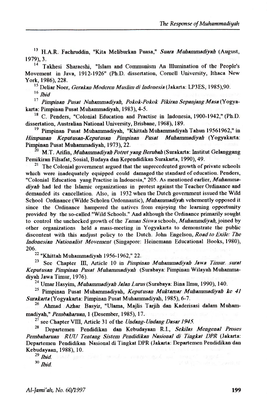Al-Jami'ah: Journal of Islamic StudiesAl-Jami'ah: Journal of Islamic StudiesArtikel ini meneliti reaksi Muhammadiyah terhadap Rancangan Undang-Undang Pendidikan Nasional tahun 1988, dengan menggunakan pendekatan yang diambil Muhammadiyah dalam menanggapi Peraturan Pemerintah tahun 1978 yang menghapus libur sekolah selama bulan Ramadan sebagai studi kasus. Muhammadiyah menilai RUU tersebut dapat diterima secara umum, kecuali beberapa bab yang berkaitan dengan tujuan pendidikan nasional, posisi pelajaran agama, sekolah agama, dan sanksi terhadap lembaga yang tidak melaksanakan undang-undang. Muhammadiyah mengkritik RUU karena mendiskreditkan mata pelajaran agama, tidak menghargai pendidikan agama, dan menghilangkan kata iman dari tujuan pendidikan nasional. Artikel ini juga membahas upaya Muhammadiyah untuk mempengaruhi proses legislasi dan hasil akhirnya, yang mengakomodasi sebagian besar tuntutan mereka.