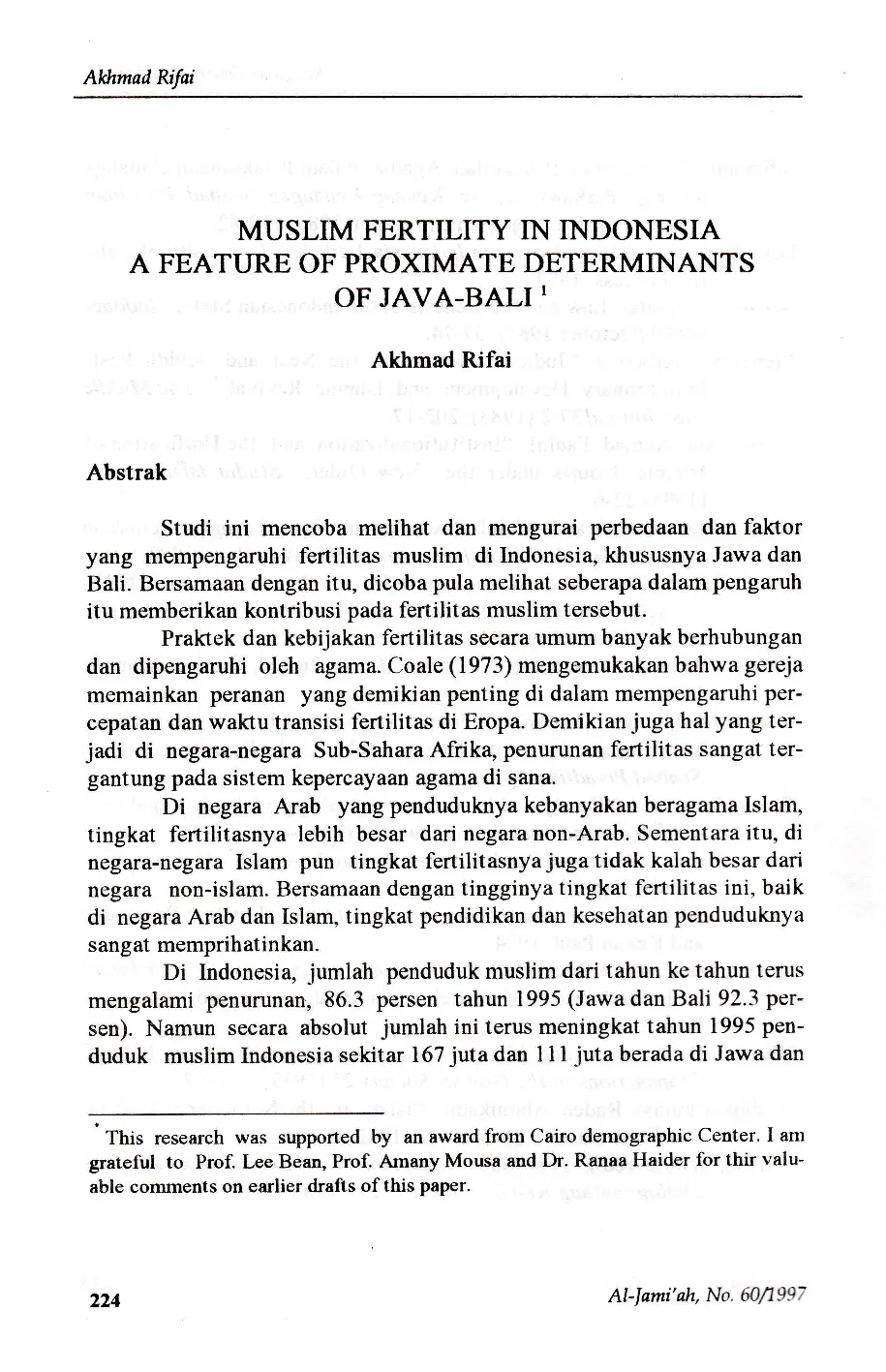 Al-Jami'ah: Journal of Islamic StudiesAl-Jami'ah: Journal of Islamic StudiesStudi ini mencoba melihat dan mengurai perbedaan dan faktor yang mempengaruhi fertilitas muslim di Indonesia, khususnya Jawa dan Bali. Bersamaan dengan itu, dicoba pula melihat seberapa dalam pengaruh itu memberikan kontribusi pada fertilitas muslim tersebut. Penelitian ini menyoroti hubungan antara agama, khususnya Islam, dengan praktik dan kebijakan fertilitas, serta perbandingan tingkat fertilitas antara negara Arab dan non-Arab, serta negara Islam dan non-Islam. Studi ini juga mengkaji penurunan jumlah penduduk muslim di Indonesia dari tahun ke tahun, meskipun secara absolut jumlahnya terus meningkat, serta kebijakan kependudukan Indonesia yang berfokus pada pembangunan sumber daya manusia dan pengendalian pertumbuhan penduduk melalui program Keluarga Berencana.