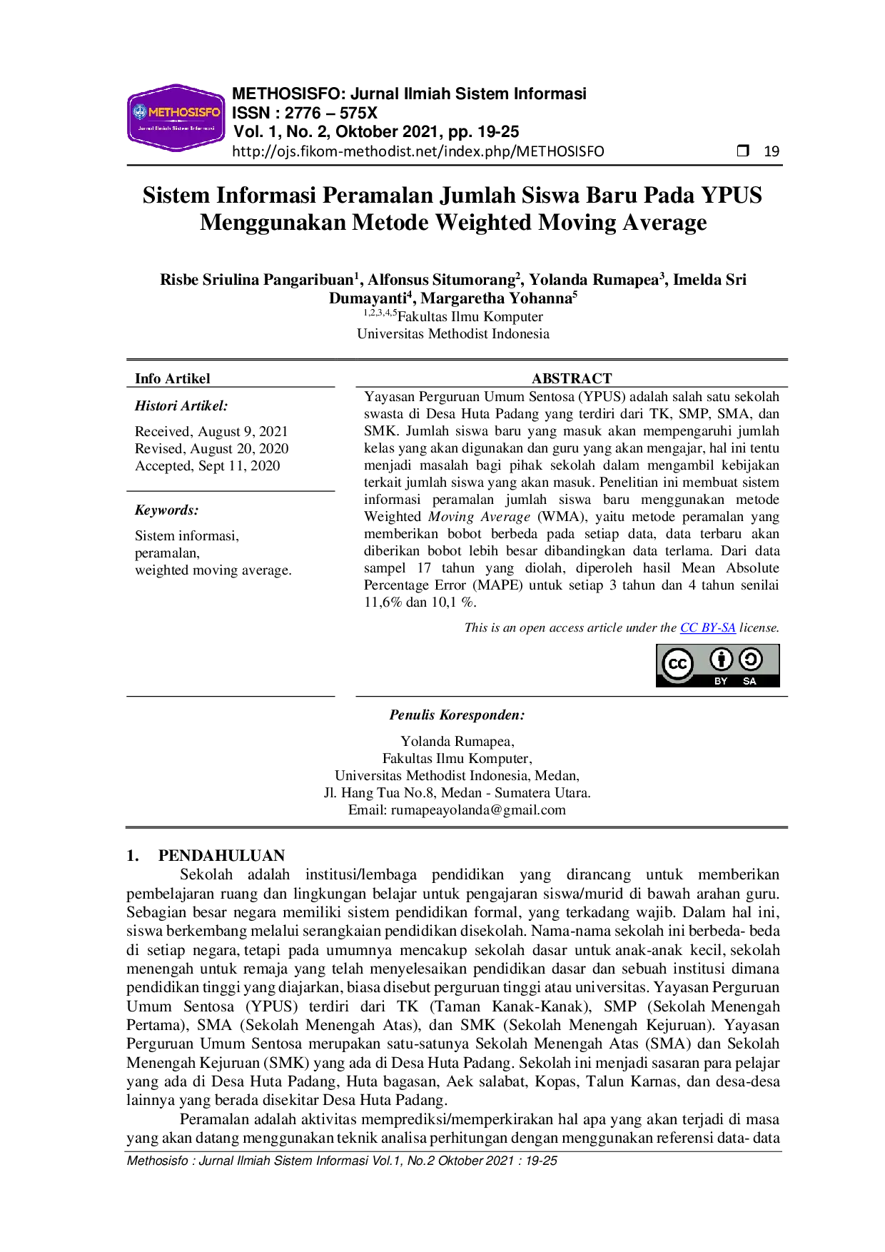METHOSISFO : Jurnal Ilmiah Sistem InformasiMETHOSISFO : Jurnal Ilmiah Sistem InformasiYayasan Perguruan Umum Sentosa (YPUS) adalah salah satu sekolah swasta di Desa Huta Padang yang terdiri dari TK, SMP, SMA, dan SMK. Jumlah siswa baru yang masuk akan mempengaruhi jumlah kelas yang akan digunakan dan guru yang akan mengajar, hal ini tentu menjadi masalah bagi pihak sekolah dalam mengambil kebijakan terkait jumlah siswa yang akan masuk. Penelitian ini membuat sistem informasi peramalan jumlah siswa baru menggunakan metode Weighted Moving Average (WMA), yaitu metode peramalan yang memberikan bobot berbeda pada setiap data, data terbaru akan diberikan bobot lebih besar dibandingkan data terlama. Dari data sampel 17 tahun yang diolah, diperoleh hasil Mean Absolute Percentage Error (MAPE) untuk setiap 3 tahun dan 4 tahun senilai 11,6% dan 10,1 %.