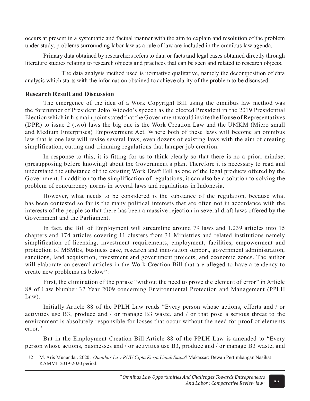 The 1st Proceeding International Conference And Call PaperThe 1st Proceeding International Conference And Call PaperOmnibus Law adalah penggabungan beberapa undang-undang menjadi satu peraturan. Tujuan pemerintah untuk membuat omnibus law adalah menggabungkan 1.244 pasal dan 79 undang-undang menjadi satu peraturan. Salah satu undang-undang yang dimasukkan dalam omnibus law adalah Undang-Undang Ketenagakerjaan. Dalam Rancangan Undang-Undang Omnibus Cipta Kerja akan menciptakan 11 perubahan termasuk penyederhanaan perizinan, persyaratan investasi, pekerja asing, jam kerja, hak dan perlindungan pekerja, menambah jenis pemutusan hubungan kerja, dan memperkuat jaminan sosial.