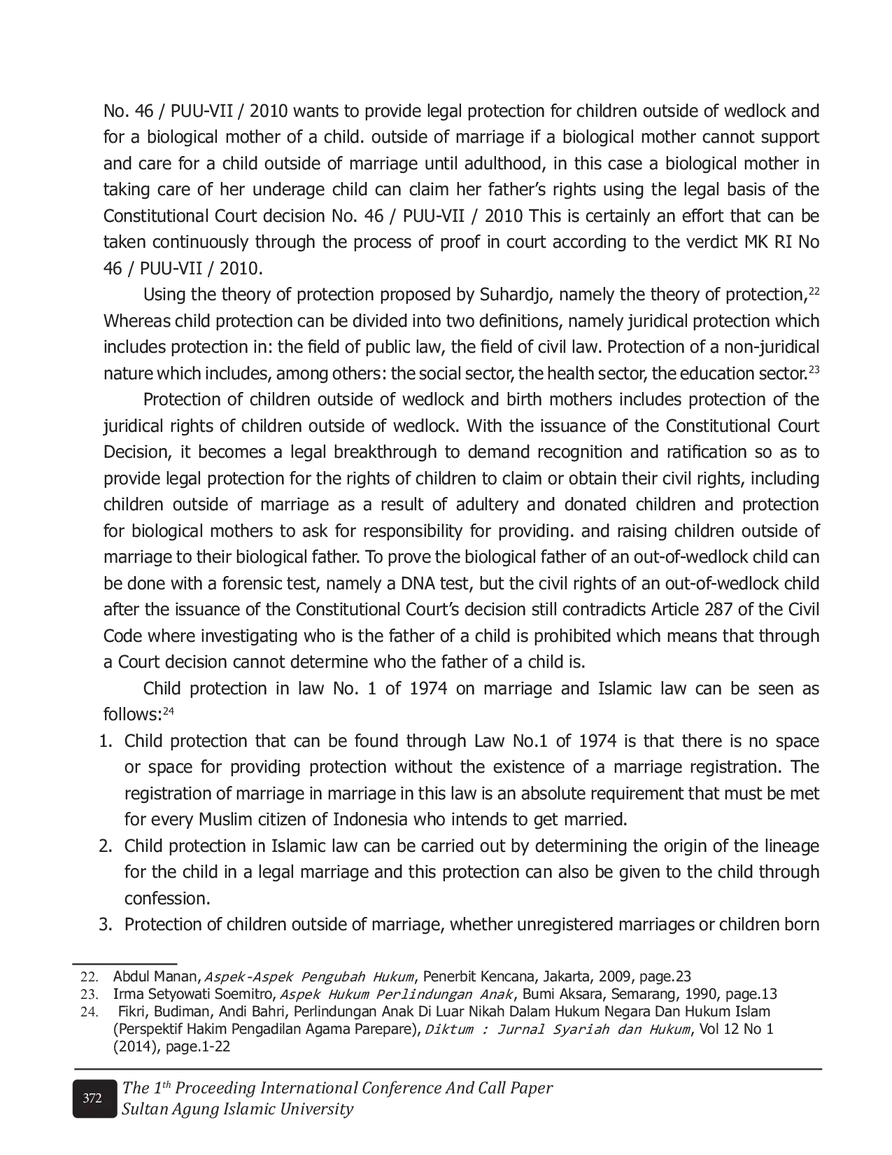 The 1st Proceeding International Conference And Call PaperThe 1st Proceeding International Conference And Call PaperAnak-anak yang lahir di luar pernikahan masih sering mengalami perlakuan diskriminatif, kekerasan dan ketidakadilan, bahkan menjadi korban dari sistem peradilan. Belakangan ini, anak-anak di luar pernikahan menjadi fenomena yang mengalami peningkatan signifikan. Belum ada kebijakan yang signifikan untuk melindungi keberadaan anak-anak di luar pernikahan di masyarakat. Metode pendekatan yang digunakan dalam penelitian ini menggunakan pendekatan yuridis normatif. Hasil penelitian diperoleh perlindungan hukum anak di luar kawin dan ibu kandung meliputi perlindungan hak yuridis anak di luar kawin. Dengan keluarnya Putusan Mahkamah Konstitusi, menjadi terobosan hukum untuk menuntut pengakuan dan ratifikasi sehingga memberikan perlindungan hukum bagi hak anak untuk menuntut atau memperoleh hak sipilnya, termasuk anak-anak yang lahir di luar nikah akibat perzinahan dan anak-anak yang diberikan dan perlindungan bagi ibu kandung untuk meminta tanggung jawab untuk menyediakan dan membesarkan anak di luar pernikahan kepada ayah kandungnya. Politik hukum anak di luar pernikahan juga berdasarkan Konvensi Hak Anak yang juga diratifikasi oleh negara Indonesia.