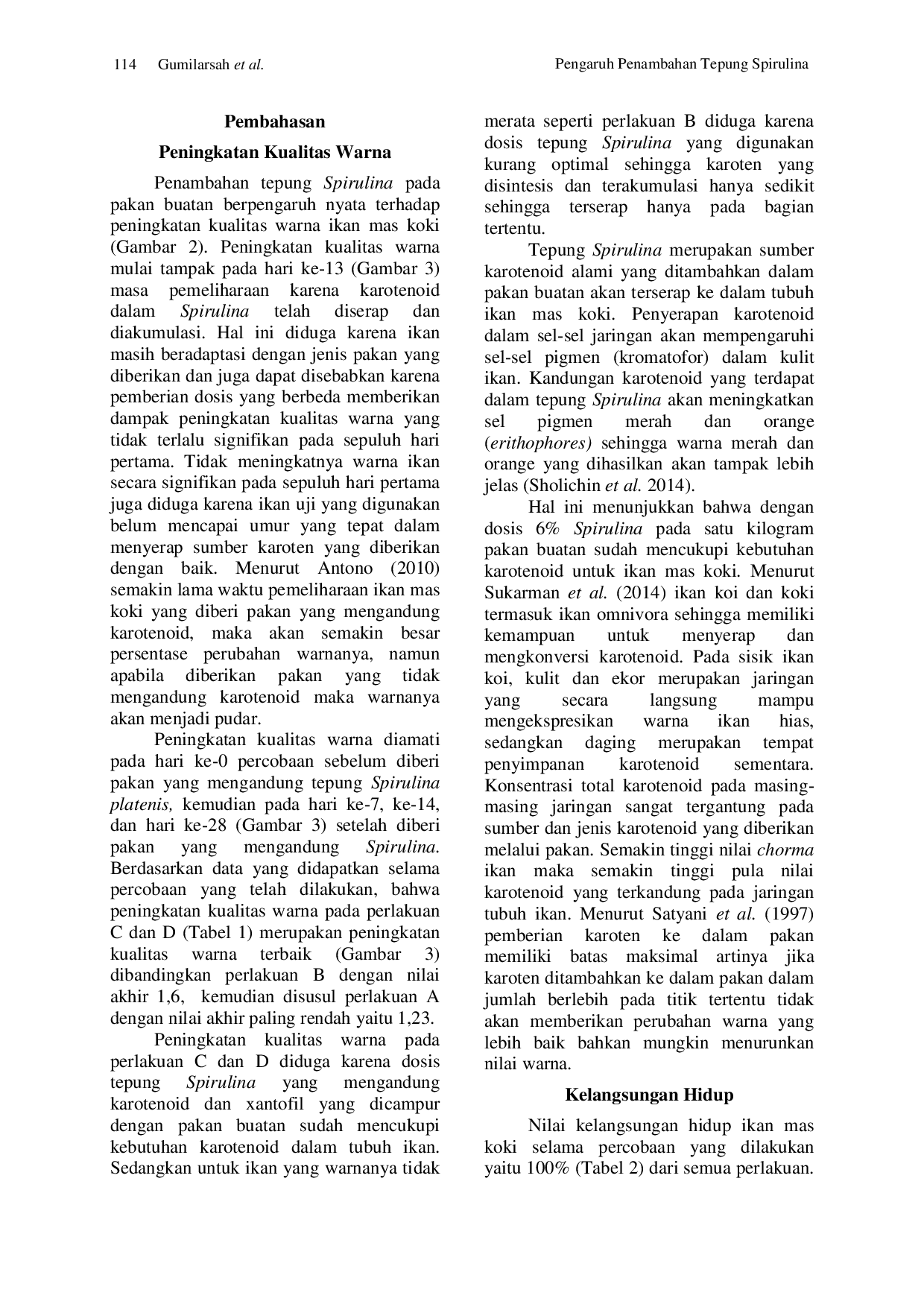 JURNAL MINA SAINSJURNAL MINA SAINSPenelitian ini bertujuan untuk mengetahui pengaruh penambahan tepung Spirulina platensis dalam pakan buatan terhadap peningkatan kualitas warna ikan mas koki (Carassius auratus). Percobaan menggunakan rancangan acak lengkap dengan 4 perlakuan dan masing-masing 3 ulangan. Perlakuan meliputi A (kontrol), B (penambahan tepung Spirulina dengan dosis 3%/1 kg pakan buatan), C (dosis 6 %/1 kg), dan D (dosis 9 %/1 kg). Hasil penelitian menunjukkan bahwa perubahan warna ikan pada hari ke-13 mulai terlihat pekat dan cerah. Dosis terbaik diperoleh pada perlakuan C dan D. Kelangsungan hidup ikan sebesar 100% pada semua perlakuan.