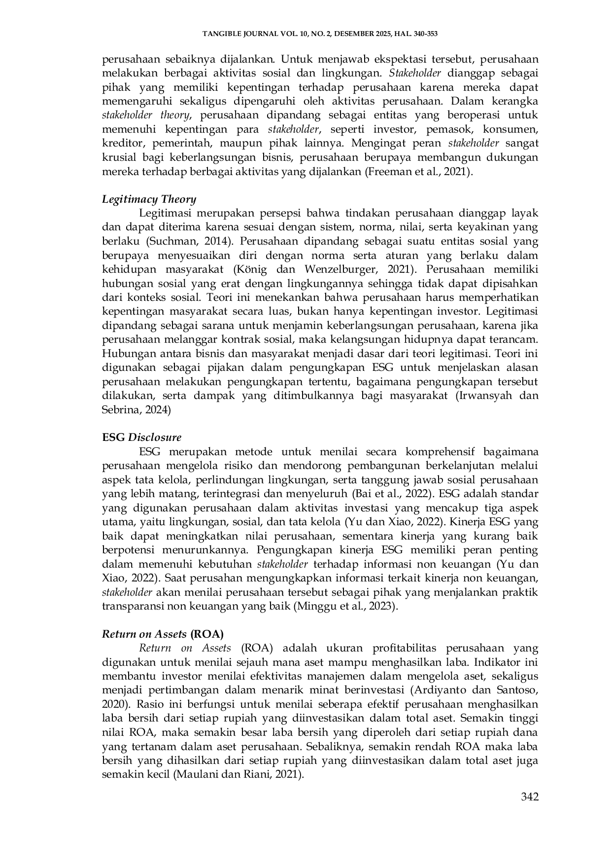 Tangible JournalTangible JournalPenelitian ini bertujuan untuk menganalisis pengaruh pengungkapan Environmental, Social, and Governance (ESG) terhadap kinerja keuangan perusahaan yang terdaftar di Bursa Efek Indonesia (BEI) selama periode 2021–2024. Data yang digunakan merupakan data sekunder yang diperoleh dari laporan keberlanjutan, laporan tahunan, dan skor ESG yang dipublikasikan oleh lembaga pemeringkat independen. Sampel penelitian dipilih menggunakan metode purposive sampling. Variabel independen dalam penelitian ini adalah tingkat pengungkapan ESG, sedangkan variabel dependen merupakan kinerja keuangan yang diukur menggunakan Return on Assets (ROA). Analisis data dilakukan menggunakan regresi linier berganda untuk menguji hubungan antara pengungkapan ESG dengan kinerja keuangan. Hasil penelitian menunjukkan bahwa environmental disclosure dan social disclosure tidak berpengaruh terhadap kinerja keuangan dan governance disclosure berpengaruh terhadap kinerja keuangan. Temuan ini mengindikasikan bahwa peningkatan pengungkapan ESG dapat memperkuat kepercayaan investor dan meningkatkan efektivitas pengelolaan risiko, sehingga menghasilkan kinerja keuangan yang lebih baik. Penelitian ini memberikan masukan bagi perusahaan di Indonesia agar lebih meningkatkan transparansi dan implementasi praktik keberlanjutan dalam rangka menciptakan nilai ekonomi jangka panjang.