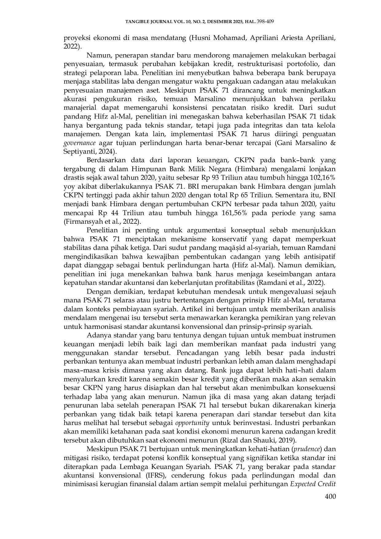 Tangible JournalTangible JournalPenelitian ini bertujuan untuk menganalisis peran penerapan PSAK No. 71 tentang Instrumen Keuangan dalam mewujudkan prinsip Hifz al Mal (menjaga harta) pada bank syariah. Penelitian ini menggunakan metode tinjauan literatur kritis dan konseptual dengan menganalisis berbagai literatur terkait PSAK 71, keuangan syariah, dan Maqashid Syariah. Hasil penelitian menunjukkan bahwa PSAK No. 71 berperan strategis dalam mendukung Hifz al Mal melalui penerapan prinsip kehati-hatian seperti pengakuan expected credit losses yang memberikan gambaran lebih awal tentang risiko. Secara konseptual, standar ini selaras dengan prinsip Islam dalam melindungi harta. Namun, implementasinya menghadapi tantangan, seperti potensi ketegangan antara penilaian wajar dan konsep nilai dalam akad syariah, yang memerlukan interpretasi yang mendalam agar selaras sepenuhnya dengan etika bisnis Islam.