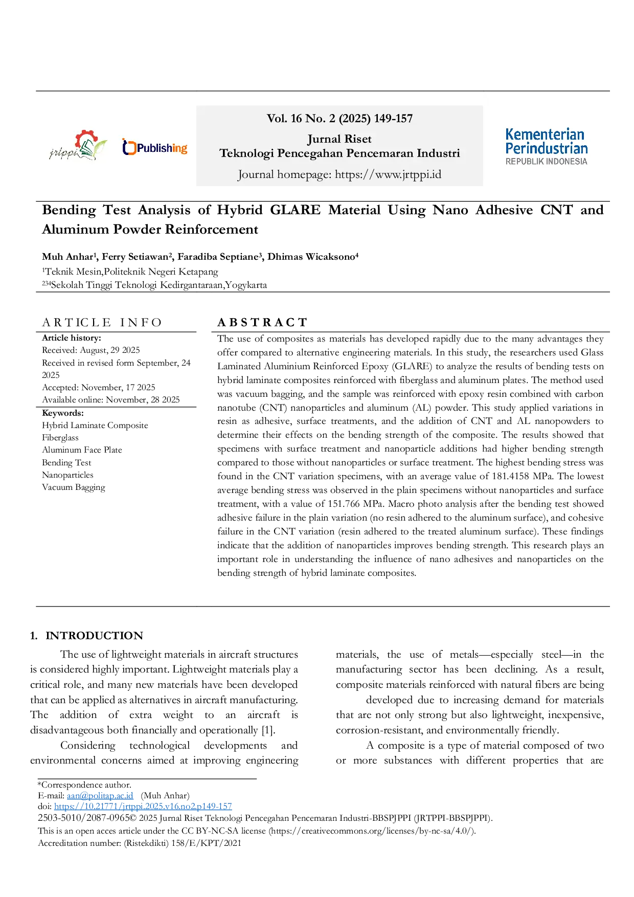 Jurnal Riset Teknologi Pencegahan Pencemaran IndustriJurnal Riset Teknologi Pencegahan Pencemaran IndustriThe use of composites as materials has developed rapidly due to the many advantages they offer compared to alternative engineering materials. In this study, the researchers used Glass Laminated Aluminium Reinforced Epoxy (GLARE) to analyze the results of bending tests on hybrid laminate composites reinforced with fiberglass and aluminum plates. The method used was vacuum bagging, and the sample was reinforced with epoxy resin combined with carbon nanotube (CNT) nanoparticles and aluminum (AL) powder. This study applied variations in resin as adhesive, surface treatments, and the addition of CNT and AL nanopowders to determine their effects on the bending strength of the composite. The results showed that specimens with surface treatment and nanoparticle additions had higher bending strength compared to those without nanoparticles or surface treatment. The highest bending stress was found in the CNT variation specimens, with an average value of 181.4158 MPa. The lowest average bending stress was observed in the plain specimens without nanoparticles and surface treatment, with a value of 151.766 MPa. Macro photo analysis after the bending test showed adhesive failure in the plain variation (no resin adhered to the aluminum surface), and cohesive failure in the CNT variation (resin adhered to the treated aluminum surface). These findings indicate that the addition of nanoparticles improves bending strength. This research plays an important role in understanding the influence of nano adhesives and nanoparticles on the bending strength of hybrid laminate composites.