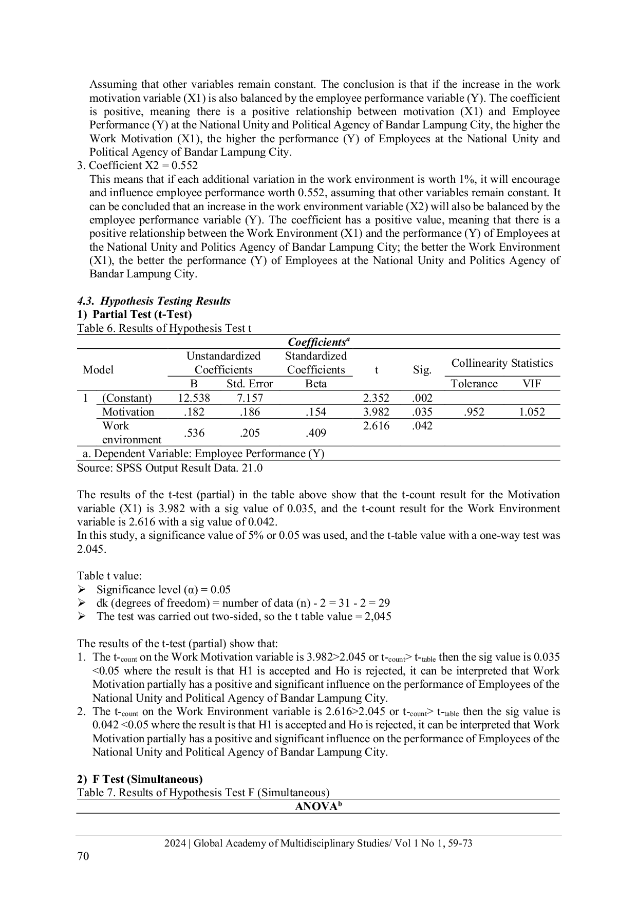 Global Academy of Multidisciplinary StudiesGlobal Academy of Multidisciplinary StudiesPurpose: This study aims to analyze the influence of work motivation and work environment on employee performance within the National Unity and Political Agency of Bandar Lampung City.. Research Methodology: The research employed a quantitative method with a survey approach. The population consisted of civil servants in the agency, and a proportional sampling technique was used to select respondents. Data were collected through questionnaires and analyzed using multiple linear regression supported by validity, reliability, t-test, F-test, and coefficient of determination to test the hypotheses.. Results: The findings demonstrate that both motivation and work environment significantly affect employee performance, both partially and simultaneously. Motivation contributes to performance through encouragement, recognition, and goal achievement, while the work environment influences performance through adequate facilities, interpersonal relations, and organizational climate. The combined effect shows a strong explanatory power for employee performance.