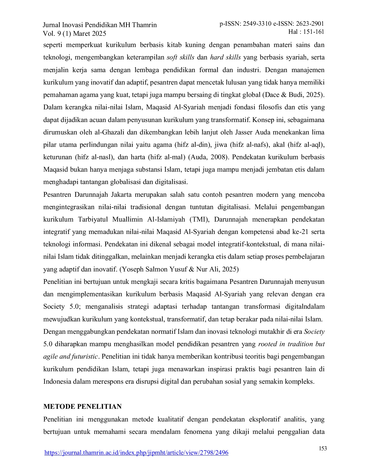 Jurnal Inovasi Pendidikan MH ThamrinJurnal Inovasi Pendidikan MH ThamrinPesantren merupakan institusi pendidikan Islam tradisional yang telah memainkan peran vital dalam pembentukan karakter, spiritualitas, dan intelektualitas umat Muslim di Indonesia. Namun, kemajuan teknologi dan transformasi sosial dewasa ini menuntut pesantren untuk beradaptasi dengan cepat agar tetap relevan dan kontributif dalam tatanan masyarakat modern. Transformasi teknologi di era Society 5.0 mendorong semua sektor, termasuk pendidikan Islam, untuk mampu mengintegrasikan teknologi canggih dengan nilai-nilai kemanusiaan. Pesantren sebagai lembaga pendidikan berbasis tradisi Islam menghadapi tantangan dan peluang besar dalam menjawab tuntutan masyarakat yang semakin terdigitalisasi dan terotomatisasi. Artikel ini membahas bagaimana Pesantren Darunnajah sebagai pesantren modern beradaptasi dengan paradigma Society 5.0 melalui pengembangan kurikulum yang menggabungkan nilai-nilai tradisional dan inovasi teknologi dengan prinsip pembelajaran digital dan human‑centered society sebagaimana diidealkan dalam konsep Society 5.0. Dengan pendekatan kualitatif eksploratif, studi ini mengandalkan data wawancara, dokumentasi, dan studi pustaka dengan analisis komparatif terhadap teori Society 5.0 dari Deguchi dan teori keterampilan abad 21 dari Bernie Trilling. Penelitian ini menunjukkan bahwa Pesantren Darunnajah telah melakukan inovasi signifikan dalam merancang kurikulum yang mengedepankan kecakapan hidup, literasi digital, dan pembentukan karakter islami secara menyeluruh. Hal ini diwujudkan melalui penerapan kurikulum Tarbiyatul Muallimin Al‑Islamiyah (TMI) yang berlandaskan pada nilai‑nilai Maqashid al‑Syariah, integrasi teknologi digital, serta penguatan kompetensi abad ke‑21.