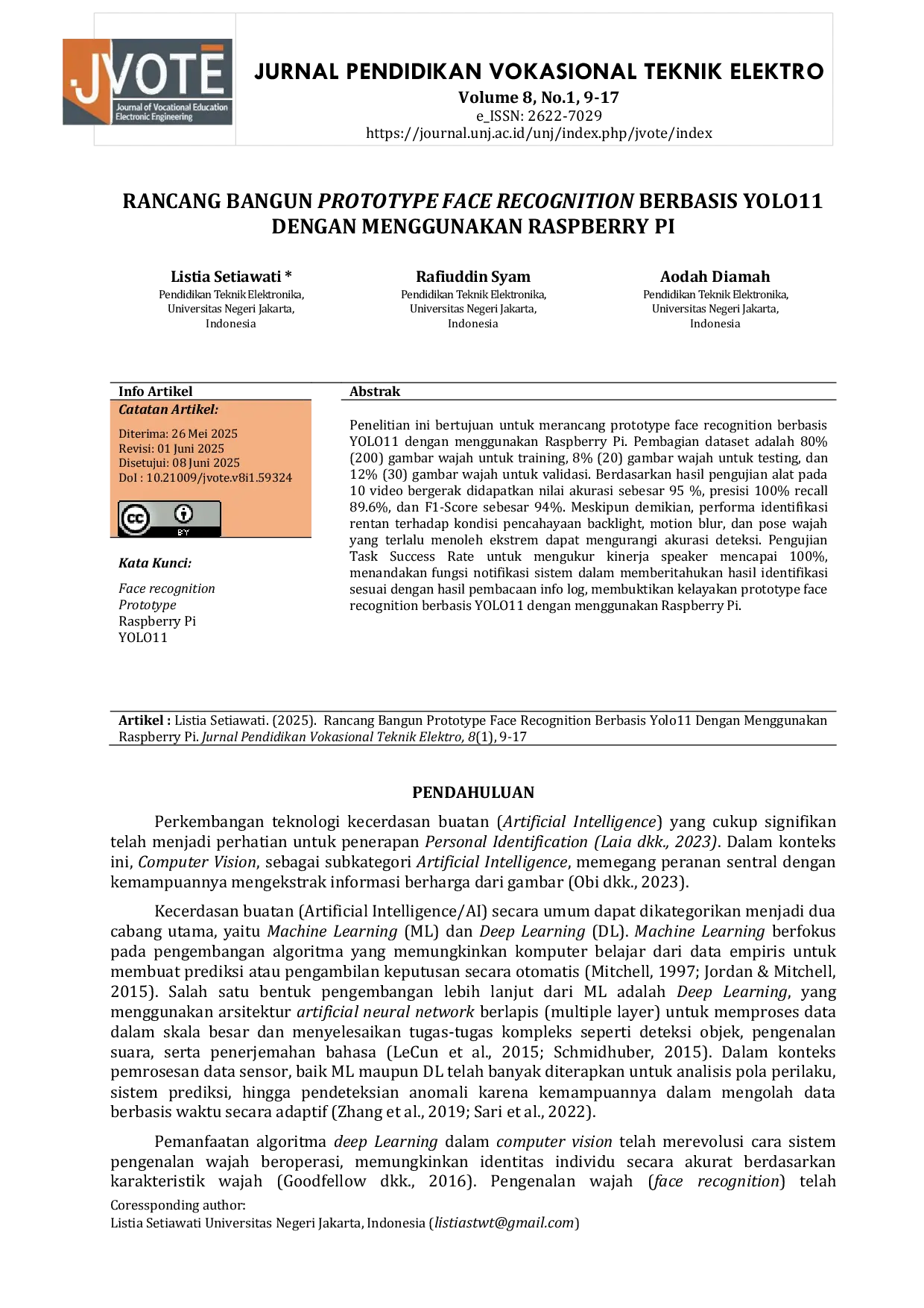 JURNAL PENDIDIKAN VOKASIONAL TEKNIK ELEKTRONIKA (JVoTE)JURNAL PENDIDIKAN VOKASIONAL TEKNIK ELEKTRONIKA (JVoTE)Penelitian ini bertujuan untuk merancang prototype face recognition berbasis YOLO11 dengan menggunakan Raspberry Pi. Pembagian dataset adalah 80% (200) gambar wajah untuk training, 8% (20) gambar wajah untuk testing, dan 12% (30) gambar wajah untuk validasi. Berdasarkan hasil pengujian alat pada 10 video bergerak didapatkan nilai akurasi sebesar 95 %, presisi 100% recall 89.6%, dan F1-Score sebesar 94%. Meskipun demikian, performa identifikasi rentan terhadap kondisi pencahayaan backlight, motion blur, dan pose wajah yang terlalu menoleh ekstrem dapat mengurangi akurasi deteksi. Pengujian Task Success Rate untuk mengukur kinerja speaker mencapai 100%, menandakan fungsi notifikasi sistem dalam memberitahukan hasil identifikasi sesuai dengan hasil pembacaan info log, membuktikan kelayakan prototype face recognition berbasis YOLO11 dengan menggunakan Raspberry Pi.