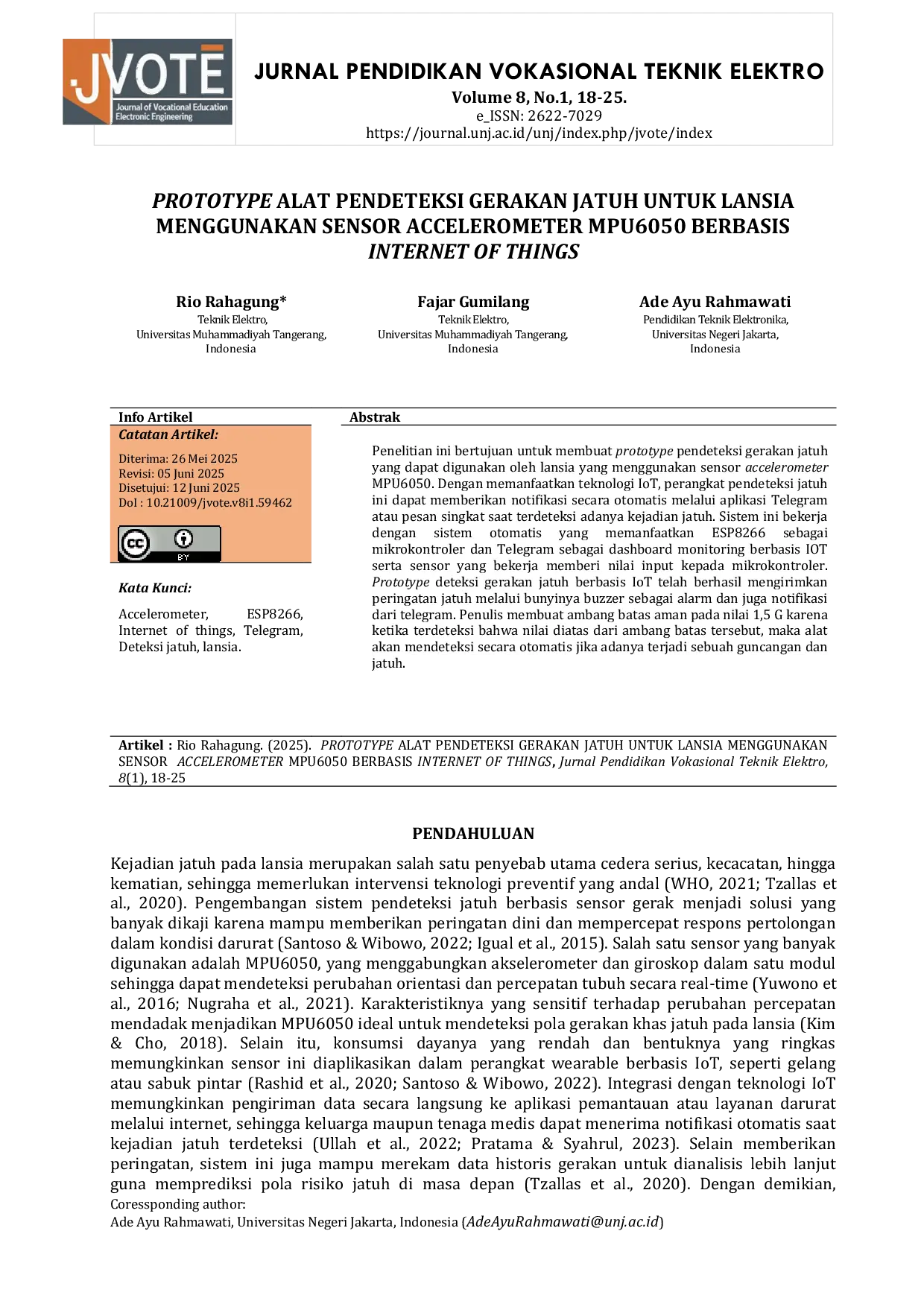 JURNAL PENDIDIKAN VOKASIONAL TEKNIK ELEKTRONIKA (JVoTE)JURNAL PENDIDIKAN VOKASIONAL TEKNIK ELEKTRONIKA (JVoTE)Penelitian ini bertujuan untuk membuat prototype pendeteksi gerakan jatuh yang dapat digunakan oleh lansia yang menggunakan sensor accelerometer MPU6050. Dengan memanfaatkan teknologi IoT, perangkat pendeteksi jatuh ini dapat memberikan notifikasi secara otomatis melalui aplikasi Telegram atau pesan singkat saat terdeteksi adanya kejadian jatuh. Sistem ini bekerja dengan sebagai sistem otomatis yang memanfaatkan ESP8266 mikrokontroler dan Telegram sebagai dashboard monitoring berbasis IOT serta sensor yang bekerja memberi nilai input kepada mikrokontroler. Prototype deteksi gerakan jatuh berbasis IoT telah berhasil mengirimkan peringatan jatuh melalui bunyinya buzzer sebagai alarm dan juga notifikasi dari telegram. Penulis membuat ambang batas aman pada nilai 1,5 G karena ketika terdeteksi bahwa nilai diatas dari ambang batas tersebut, maka alat akan mendeteksi secara otomatis jika adanya terjadi sebuah guncangan dan jatuh.