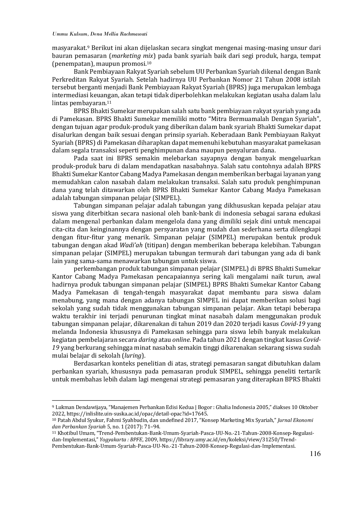 Mabny: Journal of Sharia Management and BusinessMabny: Journal of Sharia Management and BusinessPerkembangan teknologi semakin canggih dengan membentuk pola pikir masyarakat yang semakin maju dan berkembang sehingga menimbulkan persaingan yang berdampak kepada sektor lembaga perbankan di Indonesia. Adanya persaingan yang menuntut lembaga keuangan untuk berlomba-lomba dalam memberikan yang terbaik kepada nasabah. Dua fokus penelitian yang akan dikaji Pertama, untuk mengetahui bagaimana konsep tabungan simpanan pelajar (SIMPEL) di BPRS Bhakti Sumekar Kantor Cabang Madya Pamekasan, Kedua Untuk mengetahui bagaimana Strategi pemasaran pada produk tabungan simpanan pelajar (SIMPEL) di BPRS Bhakti Sumekar Kantor Cabang Madya Pamekasan. Penelitian ini menggunakan pendekatan kualitatif dengan jenis penelitian deskriptif dan sumber data diperoleh dari data primer dan data sekunder. Informannya adalah AO/AAO Pendanaan, guru di sekolah serta pelajar yang merupakan nasabah tabungan SIMPEL di BPRS Bhakti Sumekar Kantor Cabang Madya Pamekasan hasil penelitian ini menunjukkan bahwa: pertama, Tabungan simpanan pelajar (SIMPEL) di BPRS Bhakti Sumekar Kantor Cabang Madya Pamekasan merupakan tabungan yang dikhususkan untuk siswa atau pelajar dengan menggunakan akad wadiah yad-dhamanah. Karakteristik dari tabungan SIMPEL yaitu memiliki setoran awal yang sangat murah dan ringan serta persyaratan yang sangat memudahkan siswa. Kedua, strategi pemasaran yang digunakan BPRS Bhakti Sumekar Kantor Cabang Madya Pamekasan yaitu Produk (Price), Harga (Price), Tempat (Place), Promosi, (Promotion).