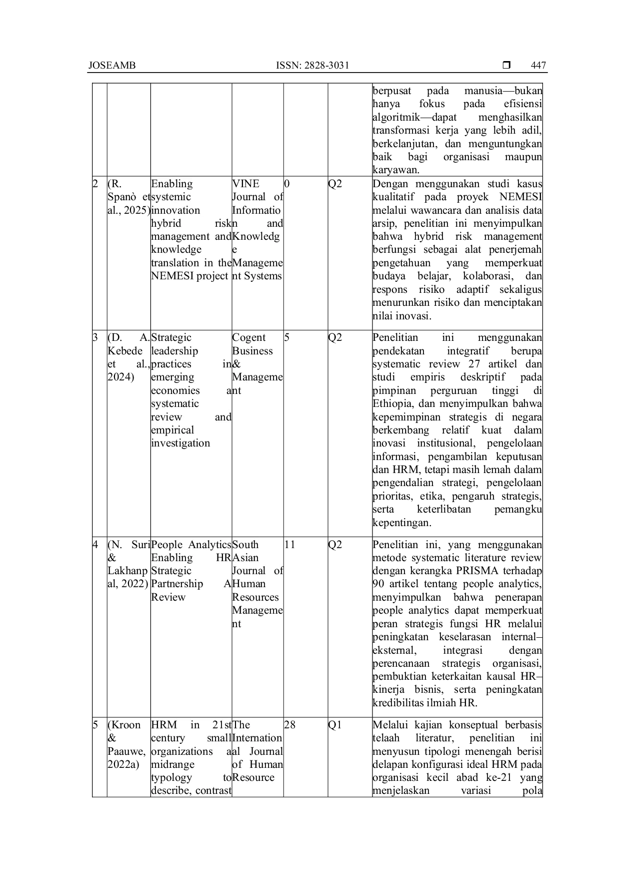 Journal of Science Education and Management BusinessJournal of Science Education and Management BusinessPenelitian ini bertujuan untuk menganalisis peran integratif fungsi Manajemen Sumber Daya Manusia (MSDM) dalam mengoptimalkan kinerja organisasi melalui pendekatan Systematic Literature Review (SLR) berbasis model PRISMA 2020. Fokus kajian meliputi enam fungsi utama MSDM, yaitu perencanaan, rekrutmen, pelatihan, penilaian kinerja, kompensasi, dan hubungan industrial. Pencarian literatur dilakukan melalui basis data Scopus dengan kata kunci “integration of strategic HRM functions, “value-oriented performance management, dan “collaborative industrial relations, yang mencakup periode 2020–2025. Dari total 58 artikel yang teridentifikasi, 35 artikel dieliminasi karena tidak memenuhi kriteria kelayakan, dan 5 artikel akhir (Tier Q1–Q2) dianalisis secara mendalam. Hasil analisis menunjukkan bahwa integrasi fungsi MSDM berperan signifikan dalam meningkatkan efektivitas organisasi melalui penguatan sinergi antara strategi bisnis, teknologi digital, dan nilai kemanusiaan. Temuan juga menegaskan pentingnya inovasi melalui people analytics, kepemimpinan strategis, serta sistem kompensasi dan hubungan industrial yang adaptif untuk mendukung kinerja berkelanjutan. Penelitian ini menyimpulkan bahwa pendekatan MSDM yang terintegrasi dan berorientasi pada manusia dapat menciptakan keunggulan kompetitif serta memperkuat daya saing organisasi di era transformasi digital.