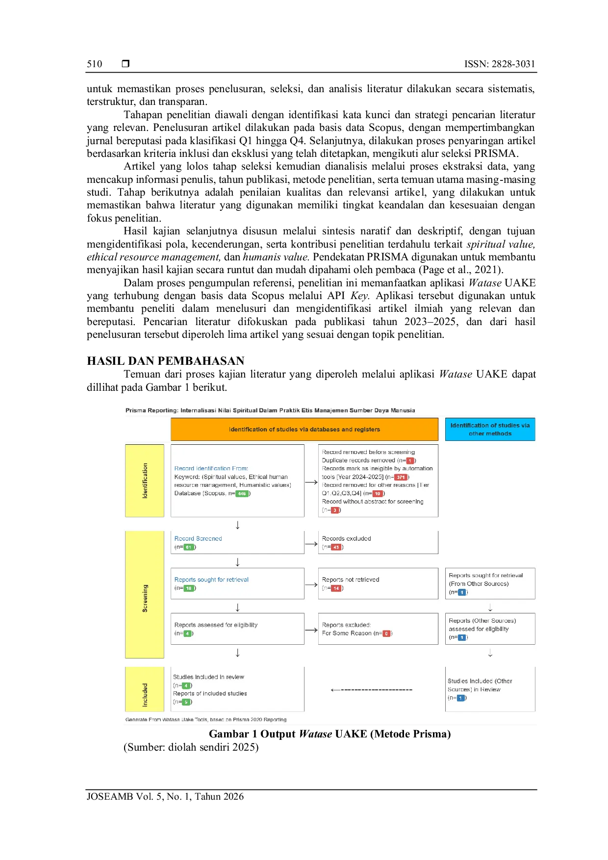 Journal of Science Education and Management BusinessJournal of Science Education and Management BusinessPenelitian ini bertujuan mengkaji (MSDM) serta keterkaitannya dengan penguatan nilai humanis dalam organisasi. Dalam dinamika organisasi modern yang dihadapkan pada tekanan kompetisi, kemajuan teknologi, dan kompleksitas sosial, praktik MSDM dituntut tidak hanya berorientasi pada efisiensi, tetapi juga pada integritas, keadilan, dan martabat manusia. Studi ini menggunakan pendekatan Systematic Literature Review (SLR) dengan pedoman PRISMA terhadap artikel bereputasi yang terindeks Scopus pada periode 2023–2025. Hasil kajian menunjukkan bahwa nilai spiritual berperan sebagai fondasi moral yang memperkuat praktik pengelolaan SDM yang etis, bertanggung jawab secara sosial, serta berorientasi pada kesejahteraan karyawan. Integrasi nilai spiritual, kepemimpinan etis, dan kebijakan SDM yang humanis terbukti mendorong perilaku kerja bermoral, kepercayaan terhadap organisasi, serta keberlanjutan jangka panjang. Temuan ini menegaskan pentingnya pendekatan holistik dalam pengembangan MSDM yang selaras dengan nilai kemanusiaan dan tujuan pembangunan berkelanjutan.