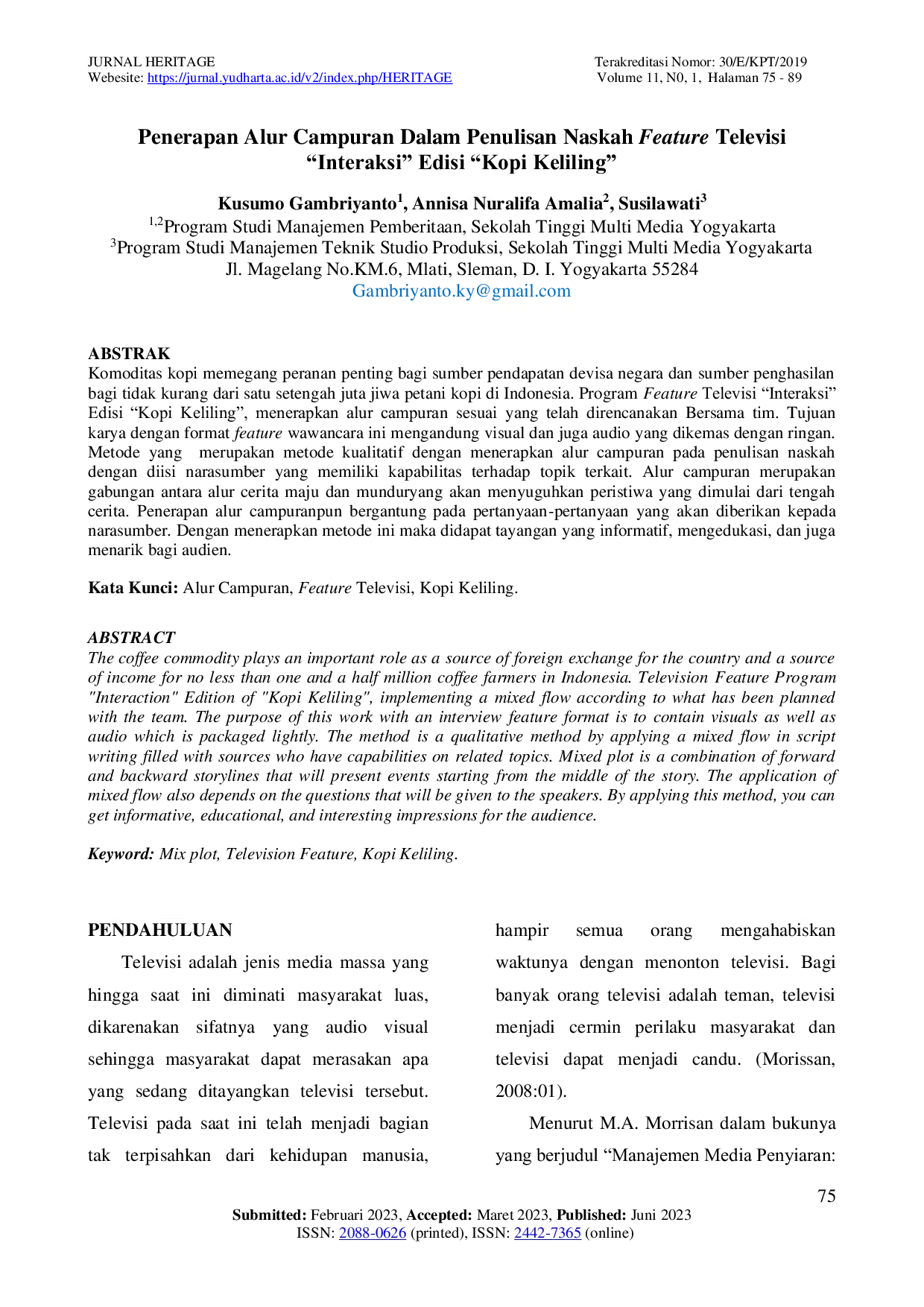 JURNAL HERITAGEJURNAL HERITAGEKomoditas kopi memegang peranan penting bagi sumber pendapatan devisa negara dan sumber penghasilan bagi tidak kurang dari satu setengah juta jiwa petani kopi di Indonesia. Program Feature Televisi “Interaksi Edisi “Kopi Keliling, menerapkan alur campuran sesuai yang telah direncanakan. Tujuan karya dengan format feature wawancara ini mengandung visual dan juga audio yang dikemas dengan ringan. Metode yang merupakan metode kualitatif dengan menerapkan alur campuran pada penulisan naskah dengan diisi narasumber yang memiliki kapabilitas terhadap topik terkait. Alur campuran merupakan gabungan antara alur cerita maju dan mundur yang akan menyuguhkan peristiwa yang dimulai dari tengah cerita. Penerapan alur campuranpun bergantung pada pertanyaan-pertanyaan yang akan diberikan kepada narasumber. Dengan menerapkan metode ini maka didapat tayangan yang informatif, mengedukasi, dan juga menarik bagi audien.