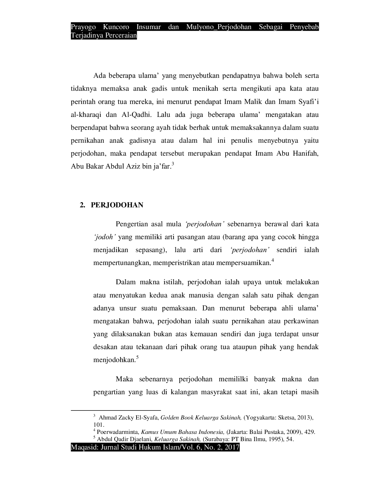 Maqasid: Jurnal Studi Hukum IslamMaqasid: Jurnal Studi Hukum IslamPerjodohan adalah upaya untuk melakukan atau menyatukan kedua anak manusia dengan salah satu pihak dengan adanya unsur suatu pemaksaan. Dan menurut beberapa ahli ulama mengatakan bahwa, perjodohan ialah suatu pernikahan atau perkawinan yang dilaksanakan bukan atas kemauan sendiri dan juga terdapat unsur desakan atau tekanaan dari pihak orang tua ataupun pihak yang hendak menjodohkan.