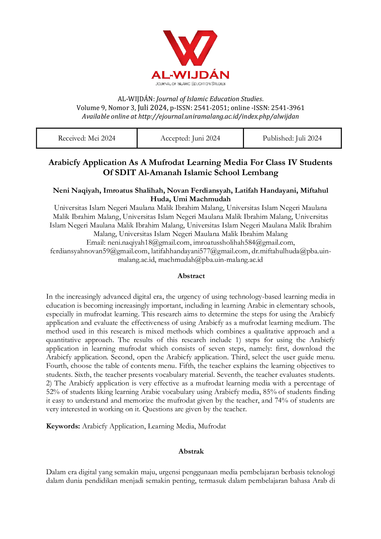 AL-WIJDÃN Journal of Islamic Education StudiesAL-WIJDÃN Journal of Islamic Education StudiesDalam era digital yang semakin maju, urgensi penggunaan media pembelajaran berbasis teknologi dalam dunia pendidikan menjadi semakin penting, termasuk dalam pembelajaran bahasa Arab di sekolah dasar khususnya pada pembelajaran mufrodat. Penelitian ini bertujuan untuk mengetahui langkah-langkah penggunaan aplikasi Arabicfy dan mengevaluasi efektivitas penggunaan Arabicfy sebagai media pembelajaran mufrodat. Metode yang digunakan dalam penelitian ini adalah mixed methods yang menggabungkan antara pendekatan kualitatif dan pendekatan kuantitatif. Hasil penelitian ini meliputi: 1) langkah-langkah penggunaan aplikasi Arabicfy dalam pembelajaran mufrodat yang terdiri dari tujuh langkah, yaitu: pertama, mendownload aplikasi Arabicfy; kedua, membuka aplikasi Arabicfy; ketiga, memilih menu panduan penggunaan; keempat, memilih menu daftar isi; kelima, guru menjelaskan tujuan pembelajaran kepada peserta didik; keenam, guru menyajikan materi kosakata; ketujuh, guru mengevaluasi peserta didik. 2) Aplikasi Arabicfy sangat efektif sebagai media pembelajaran mufrodat dengan persentase sebesar 52% siswa menyukai belajar kosakata bahasa Arab menggunakan media Arabicfy, 85% siswa merasakan kemudahan dalam memahami dan menghafal mufrodat yang diberikan guru, dan 74% siswa sangat tertarik untuk mengerjakan soal‑soal yang diberikan oleh guru.