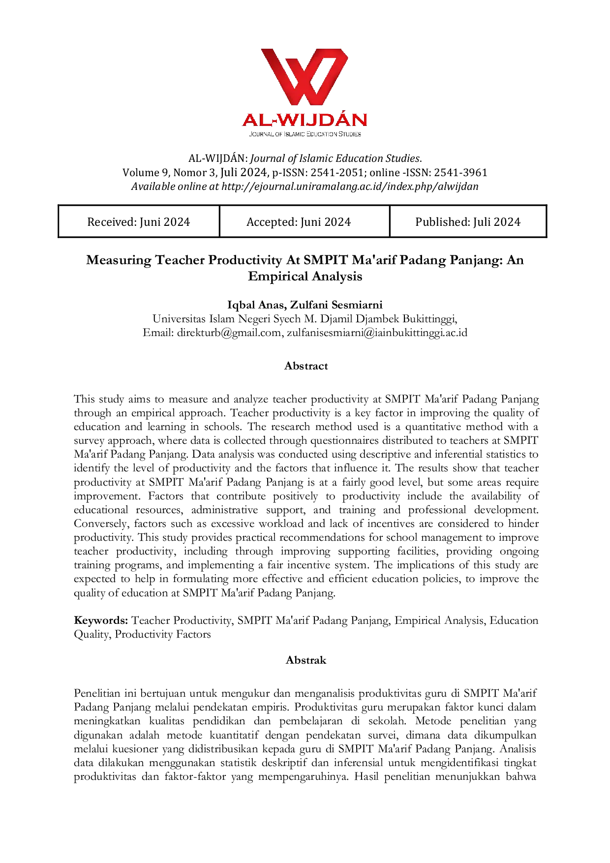 AL-WIJDÃN Journal of Islamic Education StudiesAL-WIJDÃN Journal of Islamic Education StudiesPenelitian ini bertujuan untuk mengukur dan menganalisis produktivitas guru di SMPIT Maarif Padang Panjang melalui pendekatan empiris. Produktivitas guru merupakan faktor kunci dalam meningkatkan kualitas pendidikan dan pembelajaran di sekolah. Metode penelitian yang digunakan adalah metode kuantitatif dengan pendekatan survei, dimana data dikumpulkan melalui kuesioner yang didistribusikan kepada guru di SMPIT Maarif Padang Panjang. Analisis data dilakukan menggunakan statistik deskriptif dan inferensial untuk mengidentifikasi tingkat produktivitas dan faktor-faktor yang mempengaruhinya. Hasil penelitian menunjukkan bahwa produktivitas guru di SMPIT Maarif Padang Panjang berada pada tingkat yang cukup baik, namun terdapat beberapa area yang memerlukan perbaikan. Faktor-faktor yang berkontribusi positif terhadap produktivitas meliputi ketersediaan sumber daya pendidikan, dukungan administrasi, serta pelatihan dan pengembangan profesional. Sebaliknya, faktor-faktor seperti beban kerja yang berlebihan dan kurangnya insentif dinilai menghambat produktivitas. Penelitian ini memberikan rekomendasi praktis bagi manajemen sekolah untuk meningkatkan produktivitas guru, antara lain melalui peningkatan fasilitas pendukung, penyediaan program pelatihan yang berkelanjutan, serta penerapan sistem insentif yang adil. Implikasi dari penelitian ini diharapkan dapat membantu dalam merumuskan kebijakan pendidikan yang lebih efektif dan efisien, sehingga dapat meningkatkan kualitas pendidikan di SMPIT Maarif Padang Panjang.