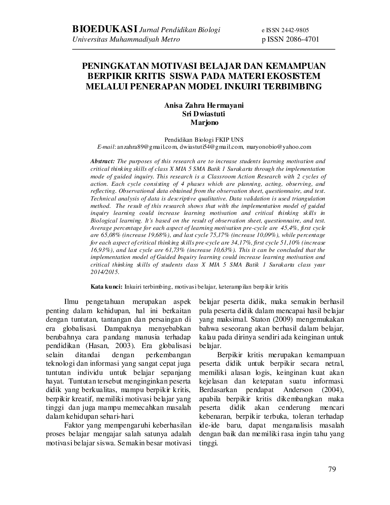 BIOEDUKASI (Jurnal Pendidikan Biologi)BIOEDUKASI (Jurnal Pendidikan Biologi)Tujuan penelitian ini adalah untuk meningkatkan motivasi belajar dan kemampuan berpikir kritis siswa kelas X MIA 5 SMA Batik 1 Surakarta melalui penerapan model inkuiri terbimbing. Penelitian ini merupakan Penelitian Tindakan Kelas (PTK) dengan 2 siklus tindakan. Setiap siklus terdiri dari 4 tahap yaitu perencanaan, tindakan, observasi, dan refleksi. Data observasi diperoleh dari lembar observasi, kuesioner, dan tes. Analisis data menggunakan teknik kualitatif deskriptif. Validasi data menggunakan metode triangulasi. Hasil penelitian menunjukkan bahwa dengan penerapan model inkuiri terbimbing dalam pembelajaran dapat meningkatkan motivasi belajar dan kemampuan berpikir kritis dalam pembelajaran biologi. Hal ini berdasarkan hasil lembar observasi, kuesioner, dan tes. Persentase rata-rata untuk setiap aspek motivasi belajar pra-siklus adalah 45,4%, siklus pertama adalah 65,08% (meningkat 19,68%), dan siklus terakhir adalah 75,17% (meningkat 10,09%), sedangkan persentase untuk setiap aspek kemampuan berpikir kritis pra-siklus adalah 34,17%, siklus pertama 51,10% (meningkat 16,93%), dan siklus terakhir adalah 61,73% (meningkat 10,63%). Dapat disimpulkan bahwa penerapan model inkuiri terbimbing dapat meningkatkan motivasi belajar dan kemampuan berpikir kritis siswa kelas X MIA 5 SMA Batik 1 Surakarta tahun pelajaran 2014/2015.