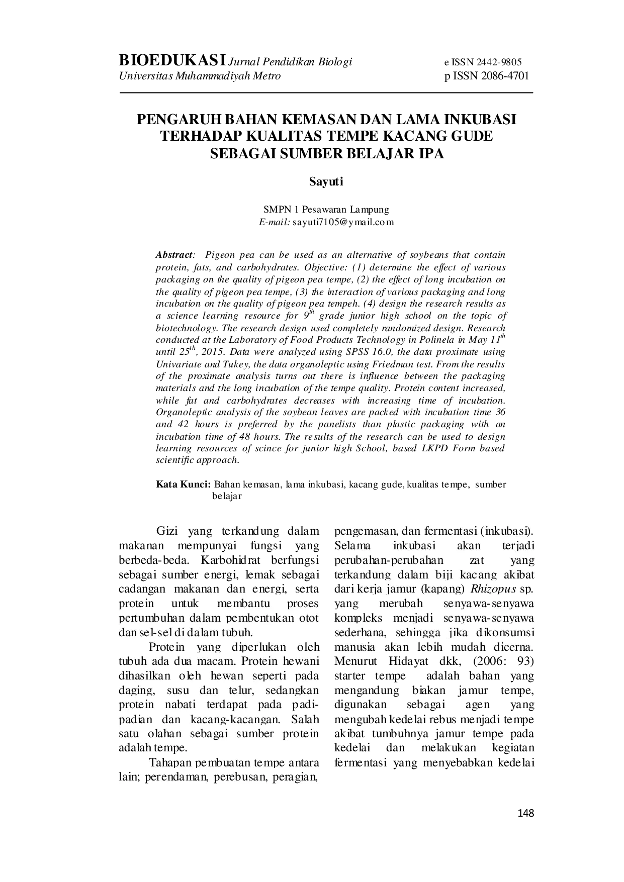 BIOEDUKASI (Jurnal Pendidikan Biologi)BIOEDUKASI (Jurnal Pendidikan Biologi)Kacang gude (Cajanus cajan (L.) Mills) dapat digunakan sebagai alternatif kedelai yang mengandung protein, lemak, dan karbohidrat. Penelitian ini bertujuan untuk (1) menentukan pengaruh berbagai bahan kemasan terhadap kualitas tempe kacang gude, (2) pengaruh lama inkubasi terhadap kualitas tempe kacang gude, (3) interaksi berbagai bahan kemasan dan lama inkubasi terhadap kualitas tempe kacang gude, dan (4) merancang hasil penelitian sebagai sumber belajar IPA untuk siswa SMP kelas IX pada topik bioteknologi pangan. Penelitian ini menggunakan rancangan acak lengkap (RAL) dengan tempe kacang gude sebagai objek penelitian. Kelompok pertama adalah berbagai bahan kemasan tempe yang umum digunakan, yaitu daun pisang, daun waru, dan plastik. Kelompok kedua adalah lama inkubasi tempe, yaitu 36 jam, 42 jam, dan 48 jam. Data dianalisis menggunakan SPSS 16.0, data proksimat dengan uji univariate dan Tukey, serta data organoleptik dengan uji Friedman. Hasil analisis proksimat menunjukkan adanya pengaruh antara bahan kemasan dan lama inkubasi terhadap kualitas tempe. Kandungan protein meningkat, sedangkan lemak dan karbohidrat menurun seiring dengan peningkatan waktu inkubasi. Analisis organoleptik menunjukkan bahwa tempe kacang gude yang dibungkus daun dengan waktu inkubasi 36 dan 42 jam lebih disukai oleh panelis dibandingkan plastik dengan waktu inkubasi 48 jam. Hasil penelitian dapat digunakan untuk merancang sumber belajar sains berbasis pendekatan ilmiah untuk siswa SMP.