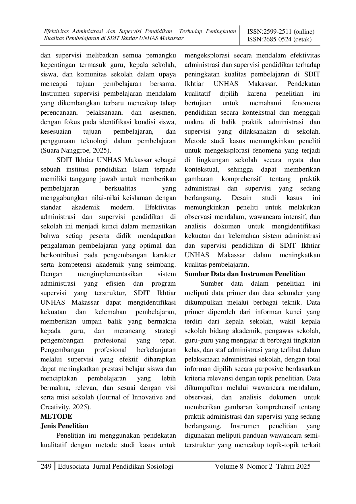 ESESPenelitian ini bertujuan untuk mengeksplorasi secara mendalam efektivitas administrasi dan supervisi pendidikan terhadap peningkatan kualitas pembelajaran di SDIT Ikhtiar UNHAS Makassar. Informan penelitian terdiri dari kepala sekolah, wakil kepala sekolah bidang akademik, pengawas sekolah, guru-guru di berbagai tingkatan kelas, dan staf administrasi yang dipilih secara purposive. Data dianalisis menggunakan teknik analisis interaktif Miles dan Huberman melalui tahapan reduksi data, penyajian data, dan penarikan kesimpulan. Hasil penelitian menunjukkan bahwa sistem administrasi pendidikan di SDIT Ikhtiar UNHAS Makassar telah terstruktur dengan baik, mencapai tingkat kelengkapan dokumen pembelajaran 96%. Program supervisi akademik dilaksanakan secara sistematis dan berkelanjutan dengan frekuensi 2 kali per semester, mencakup observasi kelas, konferensi reflektif, analisis dokumen pembelajaran, dan rapat koordinasi supervisi. Integrasi sinergis antara administrasi yang efisien dan supervisi yang terstruktur telah meningkatkan kompetensi pedagogik guru sebesar 21%, kepuasan guru terhadap proses supervisi mencapai 92%, dan penggunaan metode pembelajaran inovatif meningkat 30%. Hasil penelitian juga menunjukkan peningkatan ketuntasan belajar siswa dari 76% menjadi 88% dan rata-rata nilai siswa meningkat dari 74,2 menjadi 81,6. Meskipun menghadapi hambatan seperti keterbatasan waktu guru dan beban administratif yang tinggi, faktor-faktor pendukung berupa kepemimpinan kepala sekolah yang inspiratif (95%), budaya sekolah yang kolaboratif (92%), dan dukungan pengawas dari dinas pendidikan (98%) telah memungkinkan implementasi yang efektif. Penelitian ini menyimpulkan bahwa efektivitas administrasi dan supervisi pendidikan memiliki pengaruh signifikan dan berkelanjutan terhadap peningkatan kualitas pembelajaran, profesionalisme guru, dan prestasi belajar siswa di SDIT Ikhtiar UNHAS Makassar.