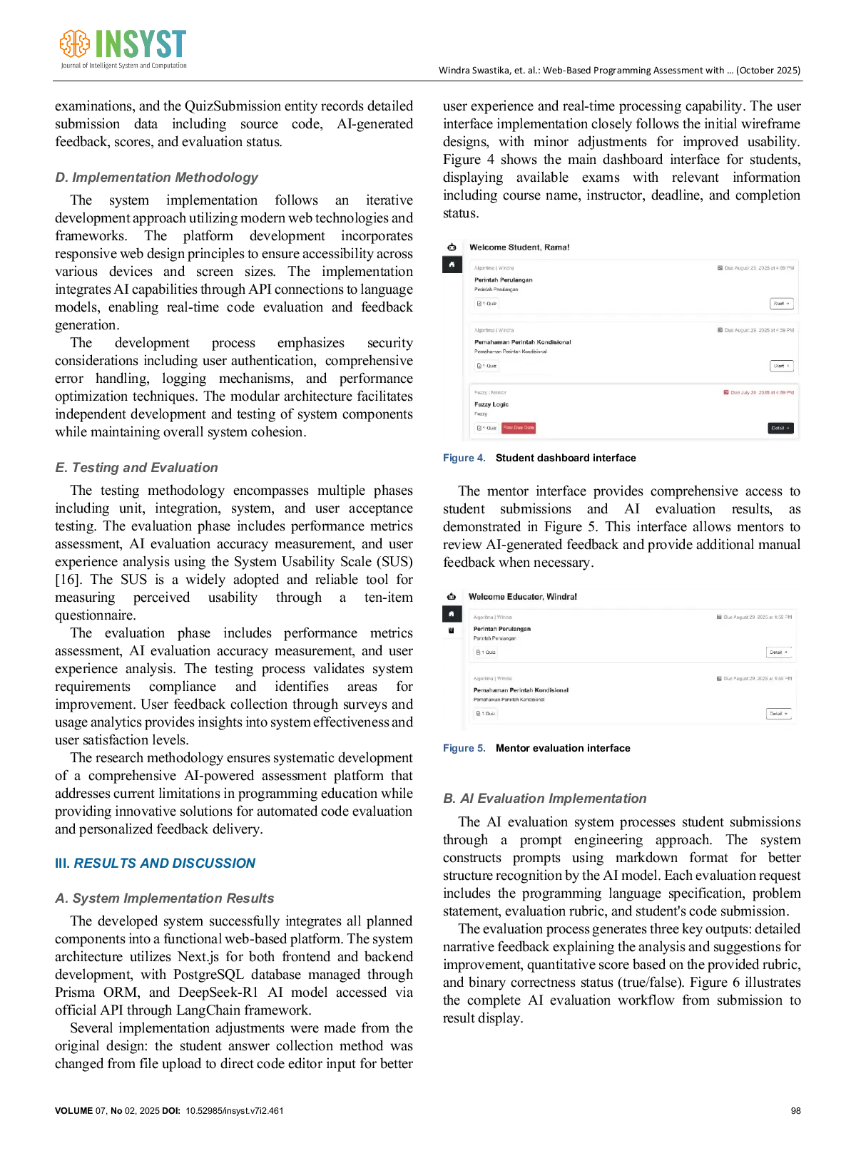 INSYST: Journal of Intelligent System and ComputationINSYST: Journal of Intelligent System and ComputationEvaluasi tugas pemrograman dalam pendidikan ilmu komputer seringkali memakan waktu dan bersifat subjektif ketika dilakukan secara manual oleh instruktur. Studi ini mengusulkan sistem evaluasi kode berbasis web otomatis yang memanfaatkan Kecerdasan Buatan (AI) untuk memberikan umpan balik segera dan objektif. Sistem dibangun dengan framework Next.js untuk antarmuka pengguna dan mengintegrasikan Model Bahasa Besar (LLM), DeepSeek-R1, melalui framework LangChain sebagai perantara komunikasi AI. Melalui integrasi ini, sistem secara otomatis menganalisis penyerahan kode sumber siswa terhadap tugas pemrograman dan rubrik penilaian yang diberikan, menghasilkan umpan balik dan skor secara real-time. Uji kinerja sistem yang diimplementasikan menghasilkan rata-rata waktu respons 5,7 detik, throughput 10,86 permintaan per detik, dan skor kinerja beban depan 78. Evaluasi pengguna menggunakan Skala Ketergunaan Sistem (SUS) menghasilkan skor 77, menunjukkan pengalaman pengguna yang positif. Sistem berfungsi efektif selama uji coba, menunjukkan bahwa evaluasi kode berbasis AI dapat mempercepat dan menyederhanakan proses penilaian dalam pendidikan pemrograman sambil mempertahankan akurasi dan ketergunaan yang memuaskan. Temuan ini menunjukkan bahwa mengintegrasikan LLM ke dalam platform pendidikan pemrograman menawarkan pendekatan yang skalabel dan efektif untuk penilaian otomatis, dengan potensi signifikan untuk meningkatkan hasil belajar dan mengurangi beban kerja instruktur di lingkungan akademis.