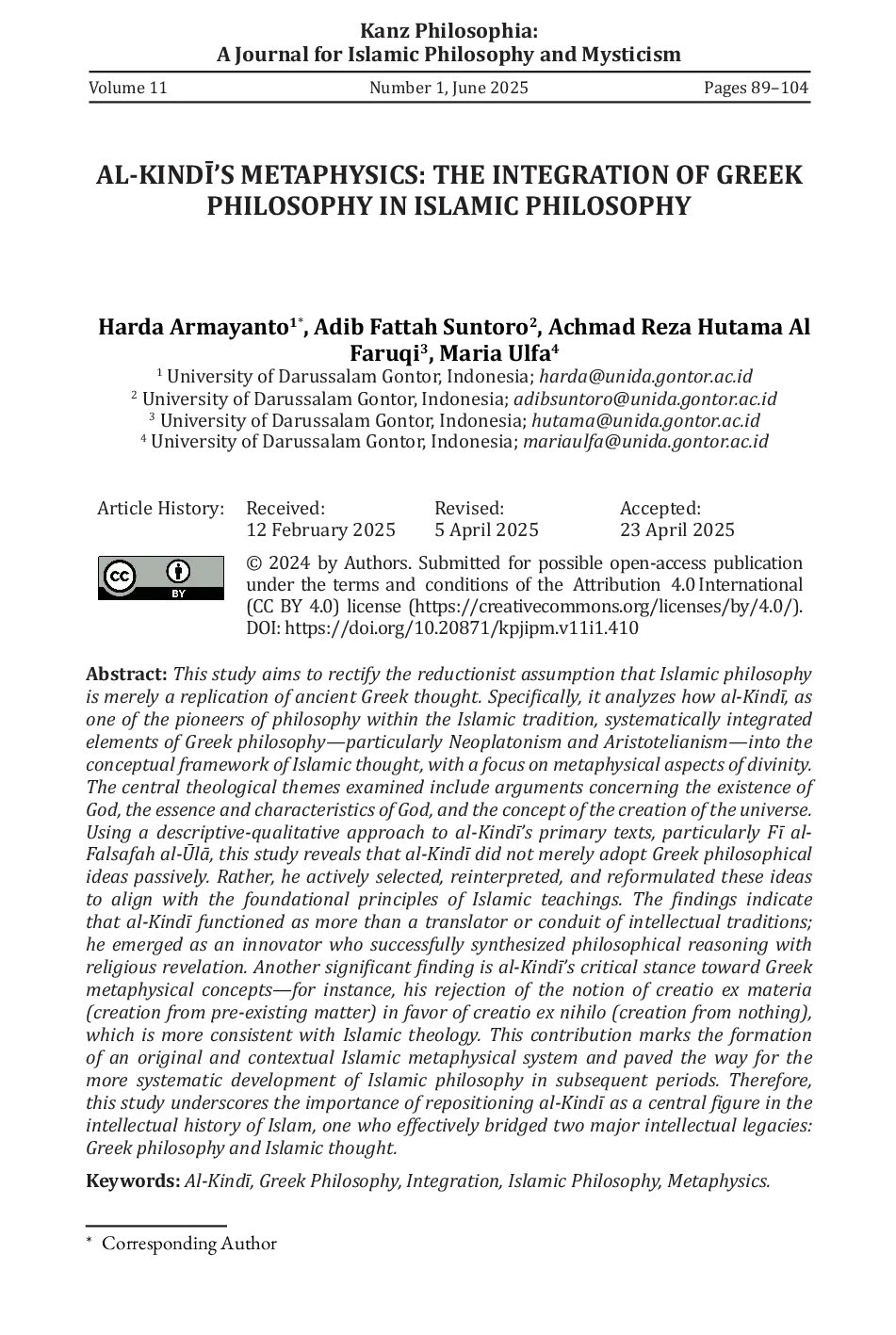 Kanz Philosophia: A Journal for Islamic Philosophy and MysticismKanz Philosophia: A Journal for Islamic Philosophy and MysticismPenelitian ini bertujuan untuk meluruskan asumsi reduksionis yang memandang filsafat Islam semata sebagai salinan dari pemikiran filsafat Yunani kuno. Kajian ini secara khusus menganalisis bagaimana al-Kindī, sebagai salah satu pelopor filsafat dalam tradisi Islam, secara sistematis mengintegrasikan unsur-unsur filsafat Yunani—terutama Neoplatonisme dan Aristotelianisme—ke dalam kerangka pemikiran Islam, dengan penekanan pada aspek metafisika ketuhanan. Pokok-pokok teologis yang dikaji mencakup argumen mengenai keberadaan Tuhan, hakikat serta esensi keilahian, dan konsep penciptaan alam semesta. Melalui pendekatan deskriptif-kualitatif terhadap teks-teks utama al-Kindī, khususnya Fī al-Falsafah al-Ūlā, ditemukan bahwa al-Kindī tidak hanya mengadopsi gagasan-gagasan filsafat Yunani secara pasif, melainkan secara aktif menyeleksi, menafsirkan ulang, serta merekonstruksi ide-ide tersebut agar konsisten dengan prinsip-prinsip dasar ajaran Islam. Hasil penelitian ini menunjukkan bahwa al-Kindī berperan lebih dari sekadar penerjemah atau penyambung tradisi intelektual; ia tampil sebagai inovator yang berhasil merumuskan sintesis antara rasionalitas filosofis dan wahyu keagamaan. Temuan penting lainnya adalah sikap kritis al-Kindī terhadap konsep metafisika Yunani, misalnya dalam menolak pandangan creatio ex materia (penciptaan dari materi yang telah ada) dan menggantikannya dengan konsep creatio ex nihilo (penciptaan dari ketiadaan) yang selaras dengan teologi Islam. Kontribusi ini menandai pembentukan sistem metafisika Islam yang orisinal dan kontekstual, sekaligus membuka ruang bagi perkembangan tradisi filsafat Islam yang lebih mapan di periode-periode berikutnya.