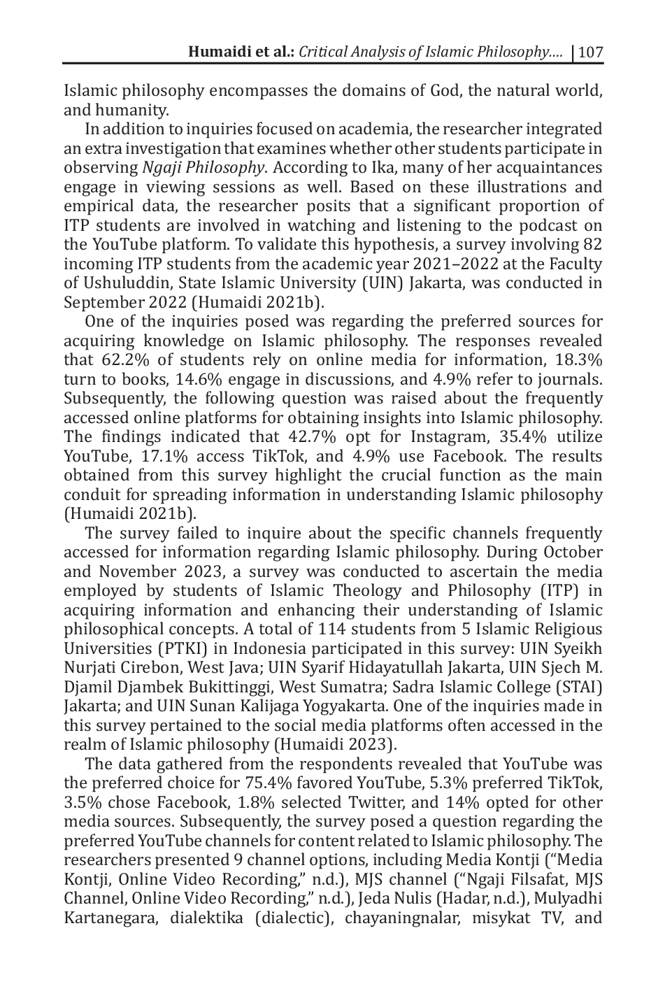 Kanz Philosophia: A Journal for Islamic Philosophy and MysticismKanz Philosophia: A Journal for Islamic Philosophy and MysticismYouTube adalah salah satu platform yang paling sering dikunjungi secara global. Posisinya berada di urutan kedua setelah Google dan memiliki peran besar dalam penyebaran filsafat Islam. Salah satu saluran YouTube terkenal yang berfungsi sebagai sumber informasi adalah milik Fahruddin Faiz di program Ngaji Filsafat. Kegiatan ini berlangsung setiap minggu pada Rabu malam di Masjid Jenderal Sudirman, Yogyakarta. Setiap kegiatan direkam kemudian dibagikan di saluran YouTube Ngaji Filsafat: Pra-Wacana-Filsafat Islam MJS dan Media Kontji. Fokus penelitian ini adalah episode 37 di YouTube MJS atau episode 38 di Media Koentji, dengna judul, Ngaji Filsafat: Pre-Discourse-Islamic Philosophy. Temuan penelitian menunjukkan bahwa saluran YouTube Ngaji Filsafat telah berdampak signifikan terhadap pemahaman filsafat Islam di kalangan mahasiswa di Universitas Islam di Indonesia. Hasil ini berasal dari survei yang melibatkan 114 mahasiswa di lima Program Studi Aqidah dan Filsafat Islam (AFI) di Indonesia. Walaupun demikian, terdapat kerancuan dan inkonsistensi Fahruddin Faiz dalam mendefinisikan filsafat Islam, sejarah, ruang lingkup dan objek kajiannya. Implikasinya adalah kaburnya makna filsafat Islam yang dari definisi ini berdampak pada ruang lingkup dan kajian. Definisi yang digunakan tidak sesuai dengan standar membuat definisi dan juga definisi ini yang disampaikan para filsuf muslim. Sedangkan secara historis, pernyataan Faiz bertentangan dan koheren dengan karya-karya historis filsafat Islam. Pendekatan yang digunakan dalam penelitian ini adalah analisa kritis dan teknik referensi silang. Metode ini berfungsi, pertama, sebagai data pelengkap untuk penjelasan tersebut dan kedua, sebagai validasi dan bukti bahwa definisi dan penjelasan Faiz tidak koheren.