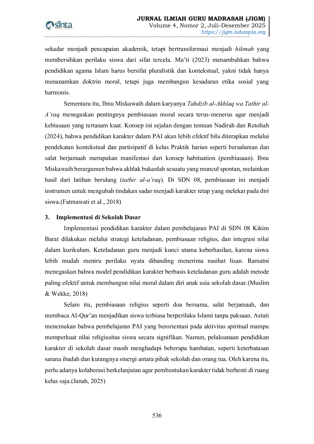Penelitian ini menegaskan bahwa implementasi pendidikan karakter religius dalam pembelajaran Pendidikan Agama Islam (PAI) di SDN 08 Kikim Barat telah berlangsung secara terintegrasi melalui kegiatan intrakurikuler, keteladanan guru, dan pembiasaan religius di lingkungan sekolah.Pembelajaran PAI tidak hanya berfungsi sebagai sarana penguatan pengetahuan keagamaan, tetapi juga sebagai medium utama internalisasi nilai-nilai karakter religius pada siswa sekolah dasar.Temuan penelitian menunjukkan bahwa nilai religiusitas, kejujuran, kedisiplinan, tanggung jawab, dan sopan santun berkembang secara efektif melalui strategi keteladanan guru (uswah hasanah) dan pembiasaan ibadah harian, seperti doa bersama, tadarus Al-Quran, dan salat berjamaah.Praktik ini membuktikan bahwa pendidikan karakter religius dalam pembelajaran PAI akan lebih bermakna apabila nilai-nilai moral tidak hanya disampaikan secara normatif, tetapi diinternalisasikan melalui pengalaman belajar yang konsisten dan kontekstual.Temuan ini memperkuat teori pendidikan karakter Thomas Lickona serta sejalan dengan pemikiran Al-Ghazali dan Ibnu Miskawaih yang menekankan pembiasaan dan keteladanan sebagai fondasi pembentukan akhlak.