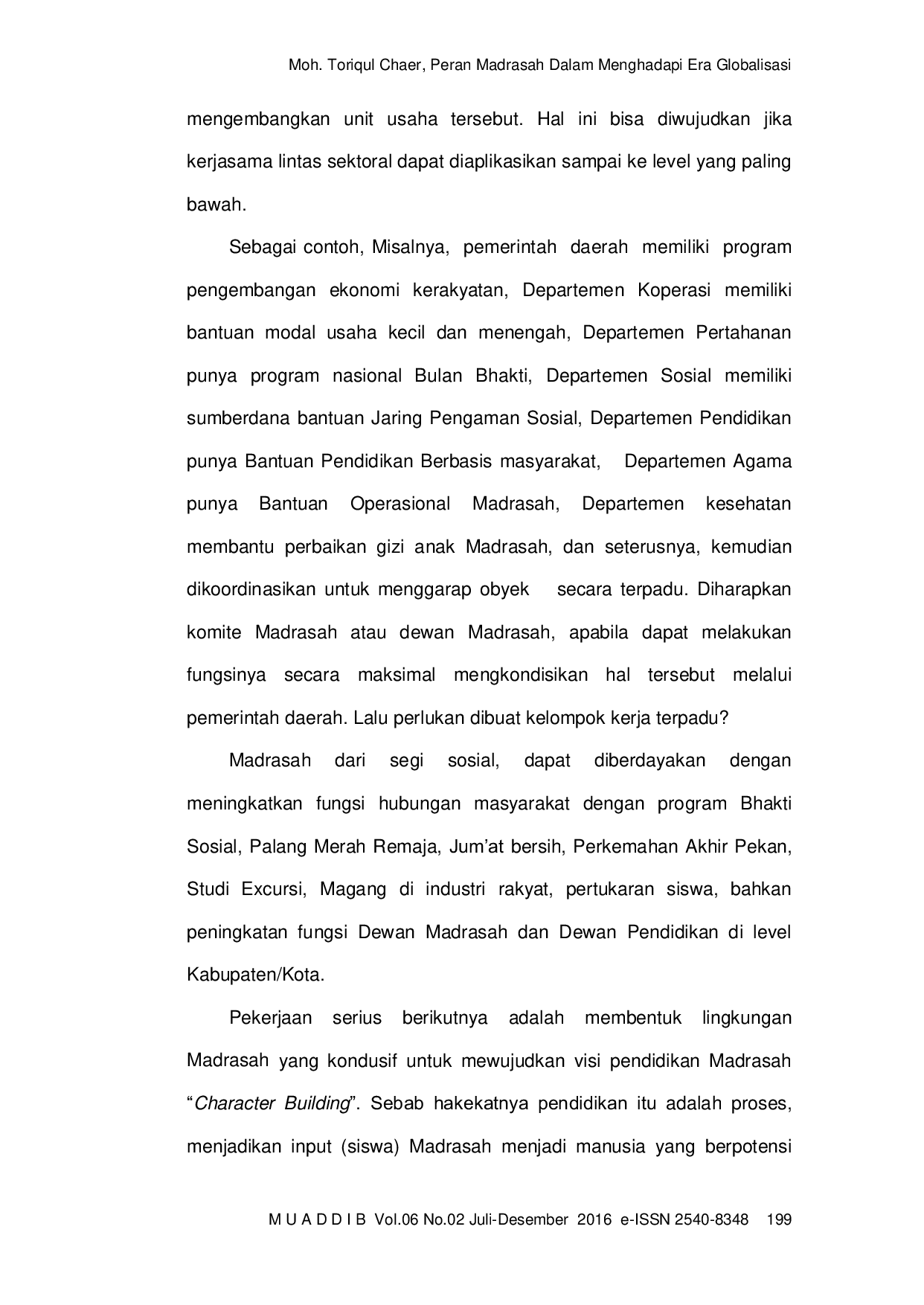 Muaddib : Studi Kependidikan dan KeislamanMuaddib : Studi Kependidikan dan KeislamanThe development of the madrasa in the context of modern it is quite interesting if it is linked with the phenomenon of globalization which brings significant changes to systems and madrasah curriculum which previously was the result of the development of the educational system individually and pretty loaded with Islamic education. Recent development shows that the madrasa has been doing adaptations with the demands of globalization, which became a milestone for the formation of modern madrasah with an image in contrast to the madrasa. In this context, the madrasa seems to not see globalization as a thing to be feared but should be faced.