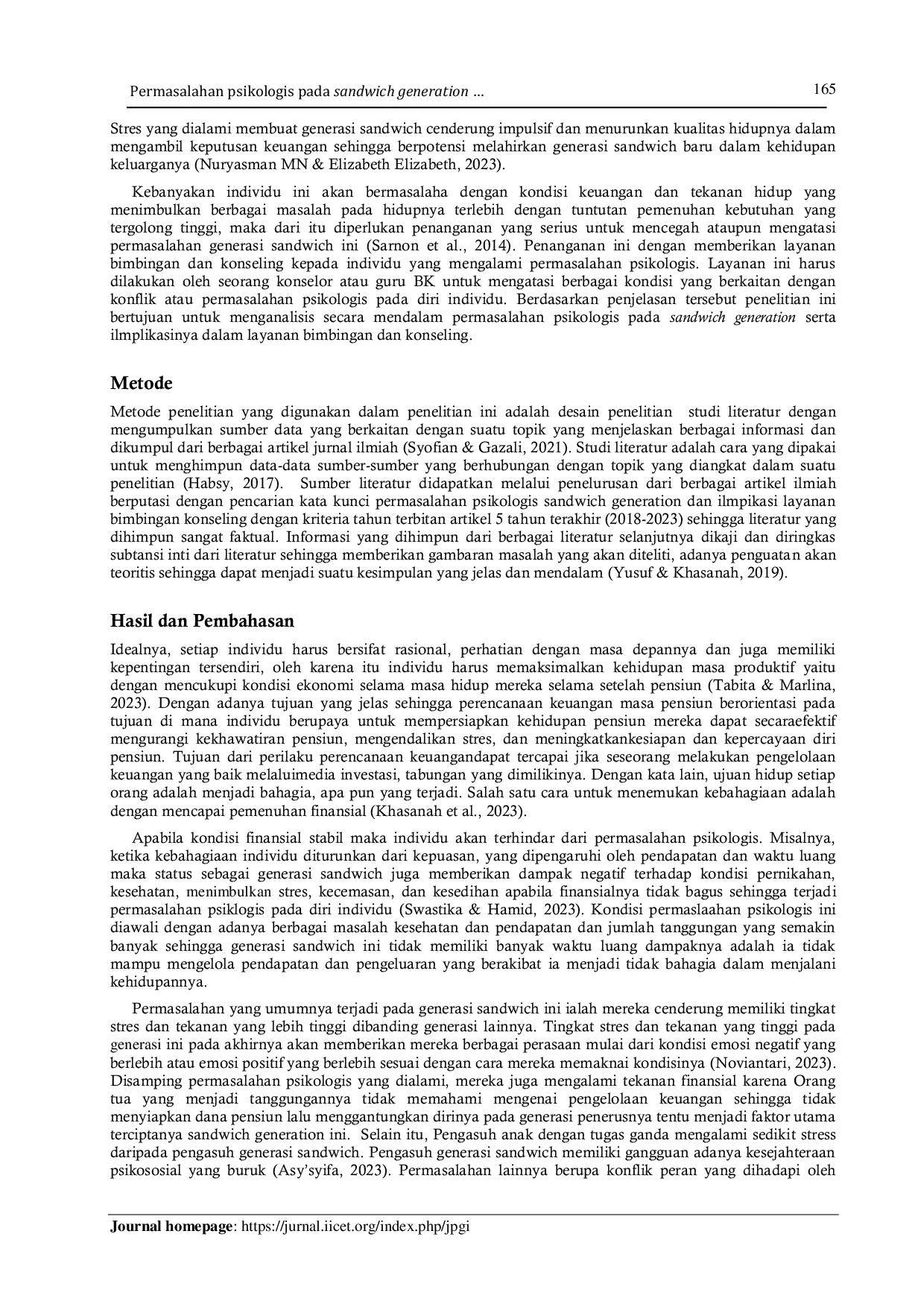 JPGI (Jurnal Penelitian Guru Indonesia)JPGI (Jurnal Penelitian Guru Indonesia)Generasi sandwich merupakan generasi yang aktif dan produktif dalam pemenuhan, generasi ini menjadi penopang dalam pemenuhan kebutuhan bagi generasi di atasnya dan generasi di bawahnya sehingga generasi sandwich harus bekerja keras dalam mencukupkan kebutuhan kehidupan keluarganya. Namun, dengan adanya tekanan yang berat dalam pemenuhan kebutuhan individu ia rentan mengalami berbagai macam permasalahan psikologis. Penelitian ini bertujuan untuk menganalisi permasalahan psikologis sandwich generation serta implikasi dalam layanan BK. Penelitian ini menggunakan metode studi literatur dengan melakukan penelurusan dan pengkajian berbagai literatur relevan dengan kata kunci penelitian dengan mengimpuan berbagai artikel ilmiah berputasi pada periode terbitan 2018-2023 sehingga literatur yang digunakan sangat fakutal. Dalam hal ini dapat dianalisis bahwa tuntutan dalam memenuhi kebutuhan hidup oleh generasi sandwich ini menimbulkan berbagai macam permasalahan psikologis pada dirinya sehingga harus dientaskan dan diselesaikan dengan memberikan berbagai bantuan oleh tenaga profesional yaitu konselor melalui layanan bimbingan dan konseling.