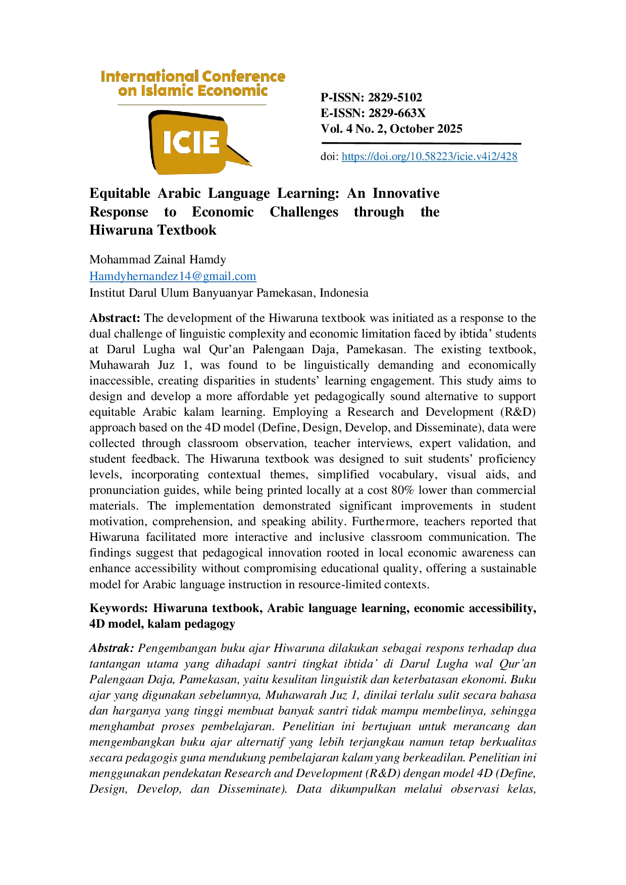 ICIEICIEThe development of the Hiwaruna textbook was initiated as a response to the dual challenge of linguistic complexity and economic limitation faced by ibtida students at Darul Lugha wal Quran Palengaan Daja, Pamekasan. The existing textbook, Muhawarah Juz 1, was found to be linguistically demanding and economically inaccessible, creating disparities in students learning engagement. This study aims to design and develop a more affordable yet pedagogically sound alternative to support equitable Arabic kalam learning. Employing a Research and Development (R&D) approach based on the 4D model (Define, Design, Develop, and Disseminate), data were collected through classroom observation, teacher interviews, expert validation, and student feedback. The Hiwaruna textbook was designed to suit students proficiency levels, incorporating contextual themes, simplified vocabulary, visual aids, and pronunciation guides, while being printed locally at a cost 80% lower than commercial materials. The implementation demonstrated significant improvements in student motivation, comprehension, and speaking ability. Furthermore, teachers reported that Hiwaruna facilitated more interactive and inclusive classroom communication. The findings suggest that pedagogical innovation rooted in local economic awareness can enhance accessibility without compromising educational quality, offering a sustainable model for Arabic language instruction in resource-limited contexts.