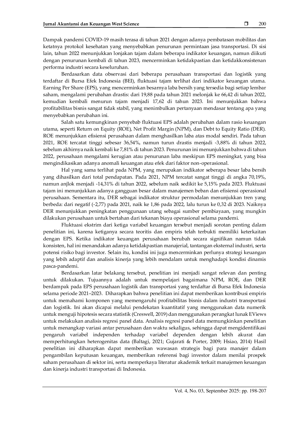 Jurnal Akuntansi Dan Keuangan West ScienceJurnal Akuntansi Dan Keuangan West ScienceIndustri transportasi dan logistik di Indonesia memiliki peran penting dalam menunjang perekonomian nasional. Selama periode 2021 hingga 2023, sektor ini menghadapi berbagai tantangan seperti Pandemi Covid-19, yang menyebabkan pembatasan mobilitas, regulasi yang berubah, biaya operasional, dan keterbatasan integrasi antar moda transportasi. Faktor-faktor ini berdampak pada kinerja keuangan perusahaan, sehingga penting untuk memahami elemen-elemen yang memengaruhi profitabilitas dan daya tarik investor. Salah satu indikator utama kesehatan finansial perusahaan adalah Earning Per Share (EPS). Tujuan dari penelitian ini adalah untuk mempelajari bagaimana Net Profit Margin (NPM), Return on Equity (ROE), dan Debt to Equity Ratio (DER) mempengaruhi EPS pada perusahaan transportasi dan logistik yang terdaftar di Bursa Efek Indonesia (BEI). Data sekunder dari tahun 2021–2023 digunakan untuk penelitian kuantitatif ini. Analisis dilakukan menggunakan Uji Model dengan bantuan perangkat lunak EViews. Variabel yang diteliti meliputi NPM sebagai gambaran kemampuan perusahaan menghasilkan laba dari pendapatan, ROE sebagai indikator efisiensi penggunaan ekuitas, serta DER yang mengukur proporsi pembiayaan utang terhadap ekuitas. Tujuan dari penelitian ini adalah untuk mengetahui seberapa besar terhadap EPS dan pengaruh memberikan wawasan strategis bagi manajemen, investor, maupun akademisi.