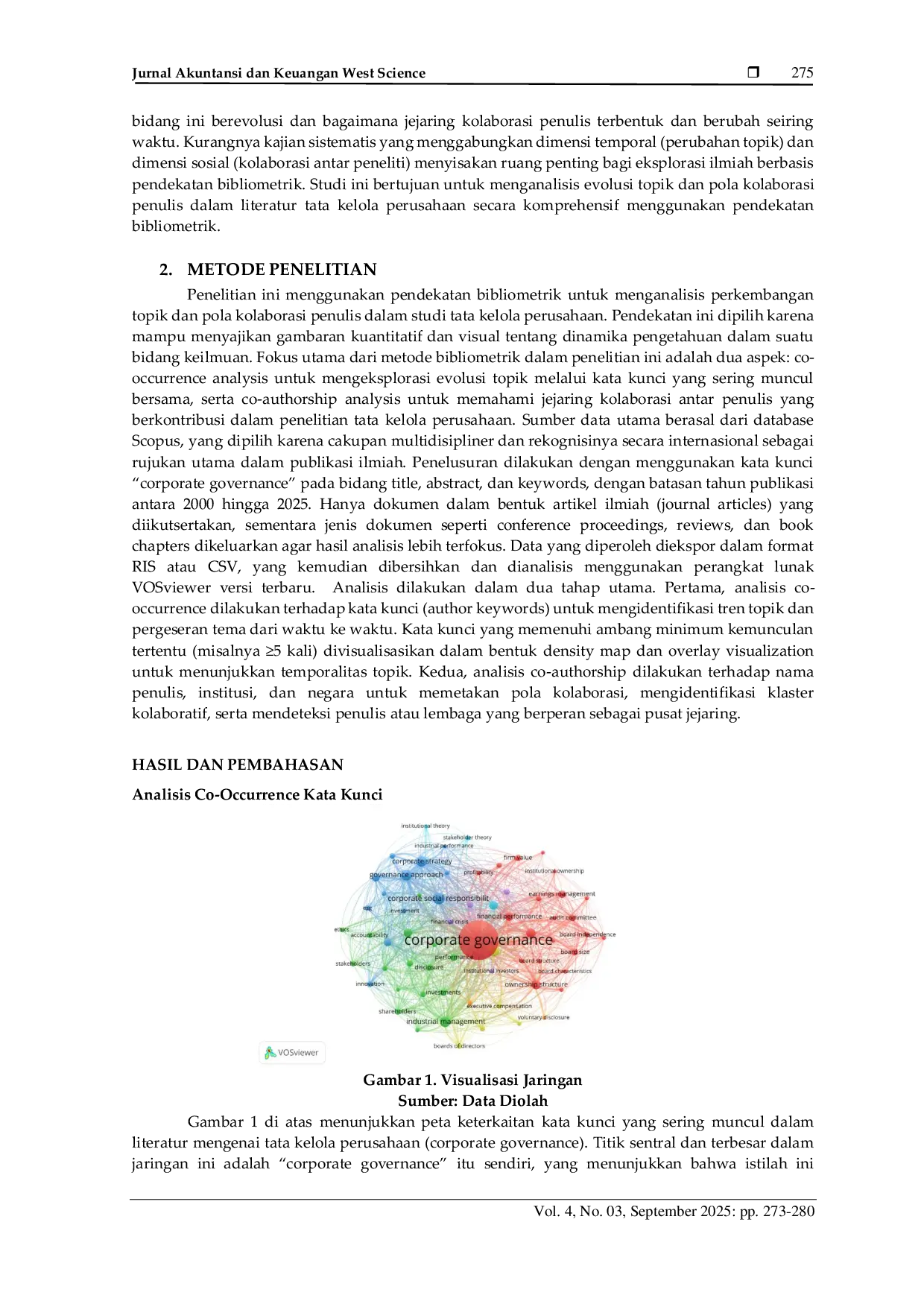 Jurnal Akuntansi Dan Keuangan West ScienceJurnal Akuntansi Dan Keuangan West SciencePenelitian ini bertujuan untuk menganalisis evolusi topik dan pola kolaborasi penulis dalam literatur tata kelola perusahaan (corporate governance) menggunakan pendekatan bibliometrik. Data diambil dari basis data Scopus dengan rentang waktu publikasi tahun 2000–2025, dan dianalisis menggunakan perangkat lunak VOSviewer. Hasil visualisasi menunjukkan bahwa topik-topik dalam studi tata kelola perusahaan telah berkembang dari isu-isu tradisional seperti struktur dewan dan kinerja keuangan menuju tema-tema kontemporer seperti tanggung jawab sosial perusahaan, ESG, dan transparansi. Selain itu, analisis co-authorship menunjukkan adanya jaringan kolaboratif yang kuat di antara penulis, institusi, dan negara-negara tertentu, dengan Amerika Serikat, Malaysia, dan Inggris sebagai simpul kolaborasi utama. Temuan ini memberikan gambaran komprehensif mengenai arah perkembangan keilmuan dan peluang kolaborasi riset lintas disiplin dan wilayah, sekaligus menjadi dasar bagi peneliti, praktisi, dan pembuat kebijakan dalam memahami dinamika keilmuan di bidang corporate governance.