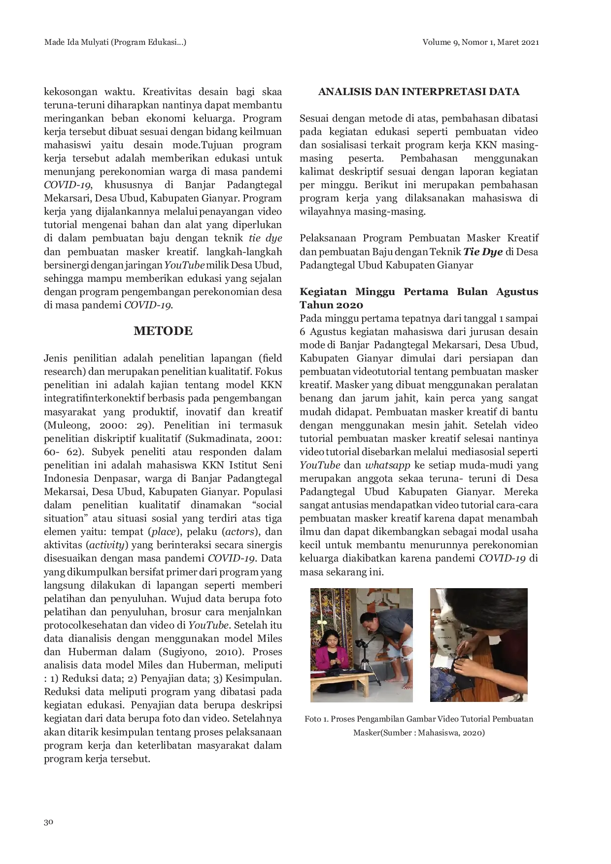 Segara Widya : Jurnal Penelitian SeniSegara Widya : Jurnal Penelitian SeniPenelitian ini mengkaji program KKN ISI Denpasar tahun 2020 dengan tema edukasi masyarakat melalui desain kreatif dalam menghadapi pandemi COVID-19. Program ini bertujuan untuk memberikan pemikiran dan edukasi kepada warga desa terkait penanggulangan dan dampak penyebaran COVID-19, khususnya di Banjar Padangtegal Mekarsari, Desa Ubud, Kabupaten Gianyar. Mahasiswa melaksanakan program KKN dengan memberikan pelatihan pembuatan masker kreatif dan pemanfaatan baju bekas dengan teknik tie dye. Program dijalankan melalui video tutorial dan pendampingan langsung, serta bersinergi dengan jaringan YouTube Desa Ubud untuk mendukung pengembangan perekonomian desa. Respon warga sangat baik, menunjukkan dukungan dan partisipasi yang tinggi dalam program edukasi ini.