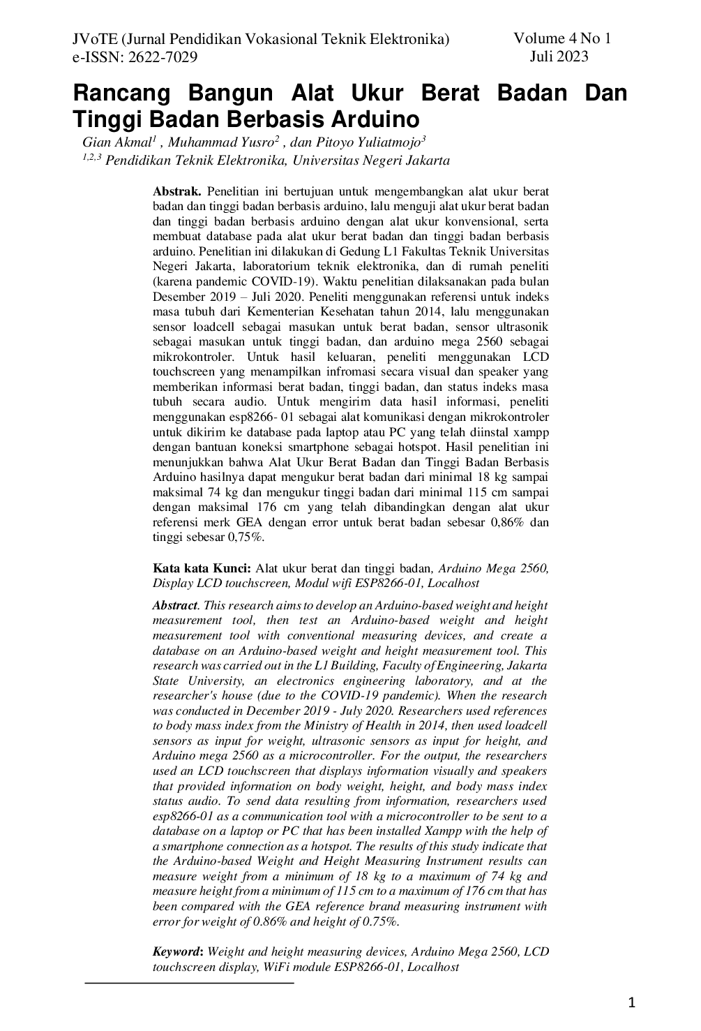 JURNAL PENDIDIKAN VOKASIONAL TEKNIK ELEKTRONIKA (JVoTE)JURNAL PENDIDIKAN VOKASIONAL TEKNIK ELEKTRONIKA (JVoTE)Penelitian ini bertujuan untuk mengembangkan alat ukur berat badan dan tinggi badan berbasis arduino, lalu menguji alat ukur berat badan dan tinggi badan berbasis arduino dengan alat ukur konvensional, serta membuat database pada alat ukur berat badan dan tinggi badan berbasis arduino. Penelitian ini dilakukan di Gedung L1 Fakultas Teknik Universitas Negeri Jakarta, laboratorium teknik elektronika, dan di rumah peneliti (karena pandemic COVID-19). Waktu penelitian dilaksanakan pada bulan Desember 2019 – Juli 2020. Peneliti menggunakan referensi untuk indeks masa tubuh dari Kementerian Kesehatan tahun 2014, lalu menggunakan sensor loadcell sebagai masukan untuk berat badan, sensor ultrasonik sebagai masukan untuk tinggi badan, dan arduino mega 2560 sebagai mikrokontroler. Untuk hasil keluaran, peneliti menggunakan LCD touchscreen yang menampilkan infromasi secara visual dan speaker yang memberikan informasi berat badan, tinggi badan, dan status indeks masa tubuh secara audio. Untuk mengirim data hasil informasi, peneliti menggunakan esp8266-01 sebagai alat komunikasi dengan mikrokontroler untuk dikirim ke database pada laptop atau PC yang telah diinstal xampp dengan bantuan koneksi smartphone sebagai hotspot.