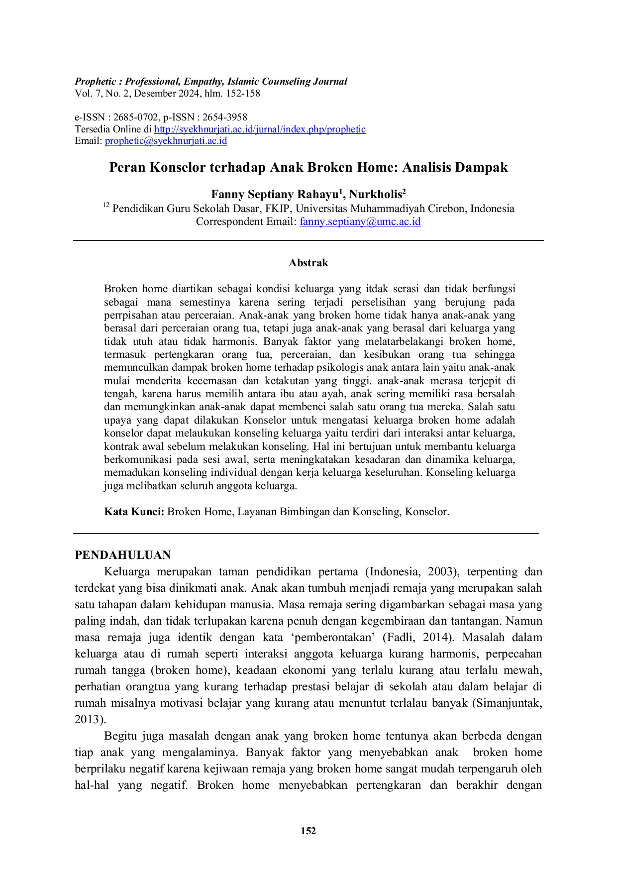 Prophetic : Professional, Empathy, Islamic Counseling JournalProphetic : Professional, Empathy, Islamic Counseling JournalBroken home didefinisikan sebagai kondisi keluarga yang tidak harmonis dan tidak berfungsi sebagaimana mestinya karena sering terjadi perselisihan yang berujung pada perpisahan atau perceraian. Anak-anak yang berasal dari broken home tidak hanya mereka yang berasal dari perceraian orang tua, tetapi juga dari keluarga yang tidak utuh atau tidak harmonis. Banyak faktor yang melatarbelakangi broken home, termasuk pertengkaran orang tua, perceraian, dan kesibukan orang tua, yang menimbulkan dampak psikologis pada anak seperti kecemasan dan ketakutan yang tinggi, perasaan terjepit, rasa bersalah, dan bahkan kebencian terhadap salah satu orang tua. Konselor dapat mengatasi masalah keluarga broken home melalui konseling keluarga yang melibatkan interaksi antar keluarga, kontrak awal, peningkatan kesadaran dan dinamika keluarga, serta penggabungan konseling individual dengan kerja keluarga secara keseluruhan.