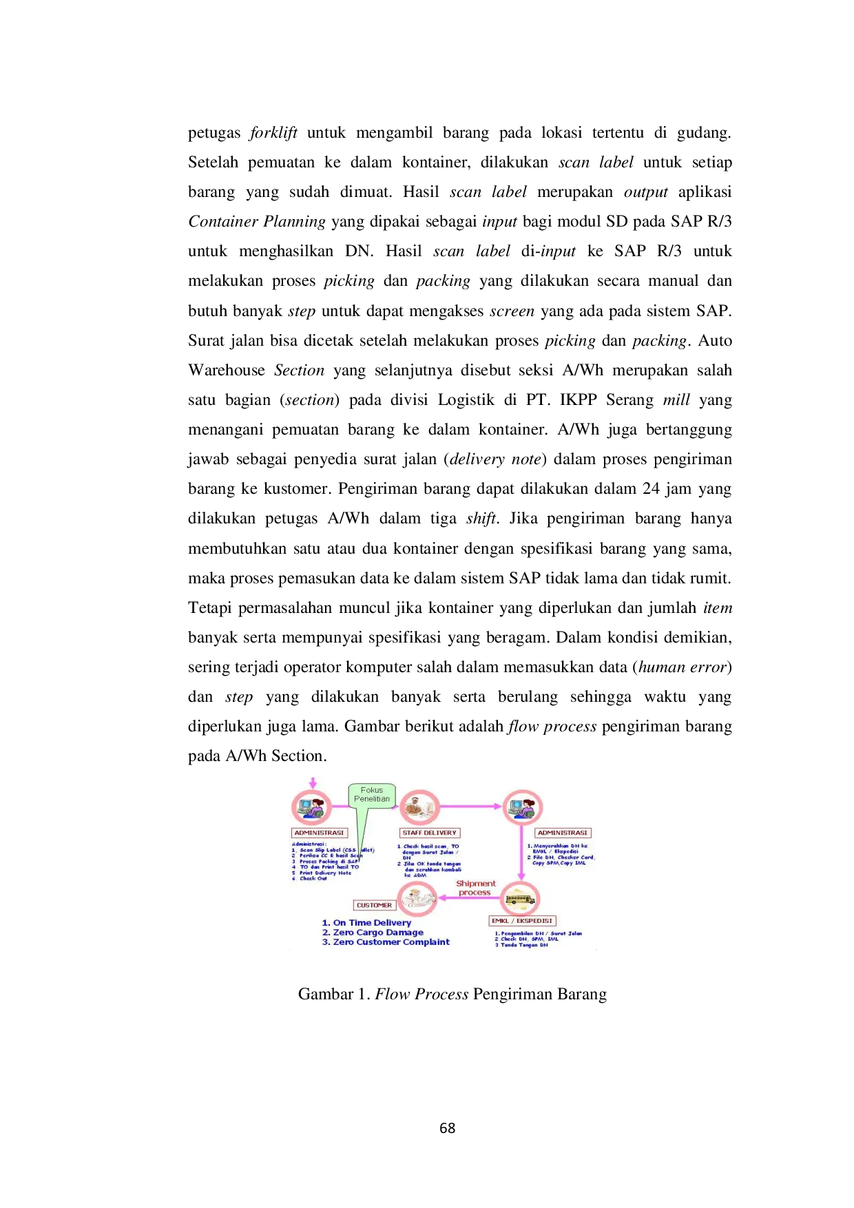 Jurnal Ilmiah Sains dan TeknologiJurnal Ilmiah Sains dan TeknologiIntegrasi data antar sistem aplikasi dan platform basis data yang berbeda diperlukan untuk menjaga sinkronisasi serta konsistensi data pada kedua sistem. PT Indah Kiat Pulp & Paper (PT. IKPP) Serang telah mengimplementasikan SAP R/3 sebagai perangkat lunak pendukung proses bisnis dan operasional secara lebih efisien dan efektif, namun tidak seluruh aktivitas operasional dapat dijalankan pada SAP, seperti proses simulasi kontainer untuk memperoleh jumlah minimum kontainer dalam pengiriman barang. Pada bagian Auto Warehouse, data input selama proses picking dan packing di SAP berupa hasil scan label pemuatan barang ke dalam kontainer yang dihasilkan oleh aplikasi Container Planning (bukan SAP) untuk pencetakan surat jalan; proses ini melibatkan banyak langkah, memakan waktu lama, serta rawan kesalahan manusia sehingga data menjadi tidak sinkron, mengakibatkan penundaan pencetakan surat jalan, keterlambatan pengiriman, dan keluhan pelanggan akibat spesifikasi serta kuantitas barang yang tidak sesuai. Penelitian ini menganalisis antarmuka program dengan metode Batch Data Communication (BDC) untuk integrasi, dengan tujuan memperpendek waktu pembuatan surat jalan dan mengurangi keluhan pelanggan terkait pengiriman yang tidak tepat.