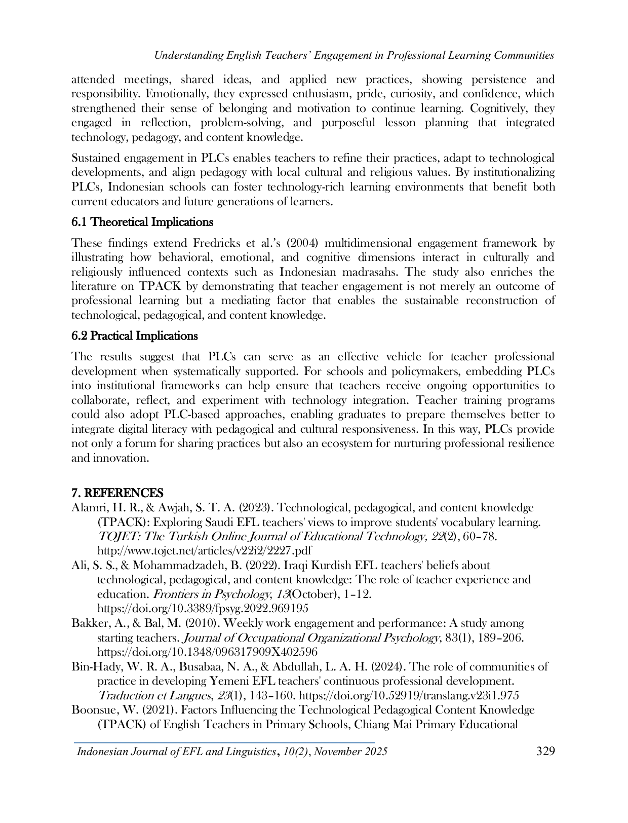 Indonesian Journal of EFL and LinguisticsIndonesian Journal of EFL and LinguisticsThis study examines the role of English teachers in Professional Learning Communities (PLCs) as they develop their Technological Pedagogical Content Knowledge (TPACK) within the context of cultural and religious norms in madrasahs in Semarang City, Indonesia. Using a qualitative ethnographic case study methodology, the data were collected through observations, questionnaires, and field notes to demonstrate teachers behavioural, emotional, and cognitive engagement. The study consisted of 50 in-service English teachers from thirty Islamic junior high schools serving varying educational backgrounds and professional learning experiences. The findings suggest, using Fredricks et al.s multidimensional framework on engagement, that the teachers were very engaged behaviourally when we measured their attendance, participation, and attempts to use technology in their classrooms. Emotionally, the teachers exhibited excitement, curiosity, key details, engagement, pride, and self-efficacy, which led them to feel connected to the PLC and motivated to experiment with different instructional practices. Cognitively, the teachers engaged in reflective practices, planning with goals, problem-solving, and pedagogically integrating technology with content. This study highlights that PLCs can be a formidable vehicle for collaborative professional growth, helping English teachers develop their technological teaching capacity and pedagogically innovate while maintaining their cultural and religious nuance. This study also highlights that TPACK reconstruction involves a process of continually engaging in multidimensional, ongoing interactions to be effectively reconstructed in a relevant context.