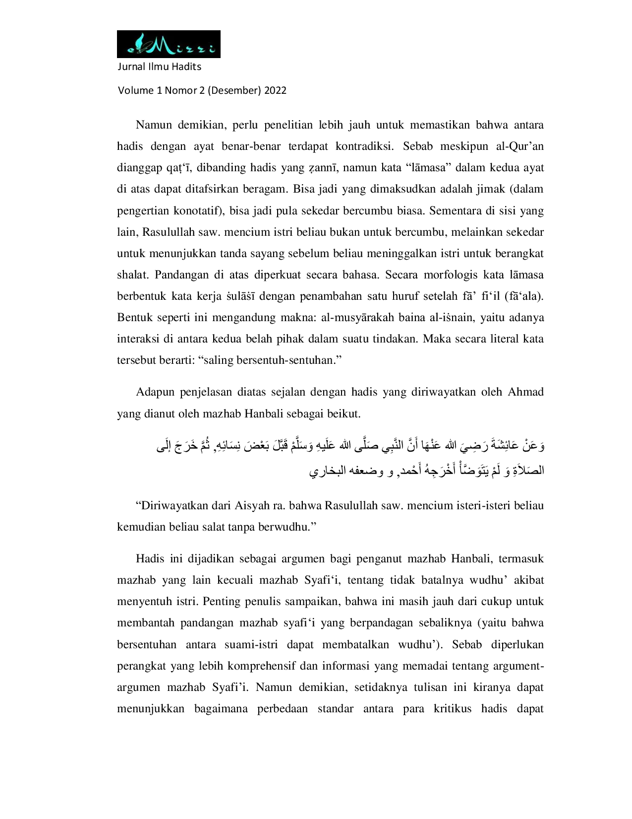 Berdasarkan penelitian, hadis tentang hukum menyentuh istri setelah wudhu berkualitas hasan dari segi sanad.Namun, matan hadis ini mengandung kontradiksi dengan ayat di dalam Al-Quran, yaitu QS.Kata lāmasa dalam kedua ayat tersebut dapat ditafsirkan beragam, apakah bermakna jimak atau hanya bercumbu biasa.Hadis yang diriwayatkan oleh Ahmad dan dianut oleh mazhab Hanbali menunjukkan bahwa Rasulullah mencium isteri-isteri beliau kemudian salat tanpa berwudhu.Namun, Imam Bukhari menganggap hadis ini lemah.Perbedaan standar antara para kritikus hadis ini berimplikasi pada perbedaan tingkat kesahihan hadis, yang pada akhirnya menjadi dasar penetapan hukum fikih.