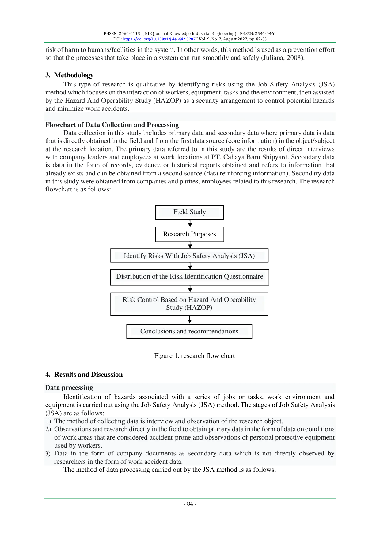 JKIE (Journal Knowledge Industrial Engineering)JKIE (Journal Knowledge Industrial Engineering)Penelitian ini bertujuan untuk menentukan risiko kecelakaan kerja pada kegiatan galangan kapal, mengendalikan risiko tersebut, serta memberikan saran perbaikan. Risiko diidentifikasi menggunakan metode Job Safety Analysis (JSA) yang dibantu oleh Hazard And Operability Study (HAZOP) untuk mengendalikan bahaya potensial serta merekomendasikan sistem keselamatan baru guna meminimalkan kecelakaan kerja. Metode penelitian yang digunakan bersifat kualitatif, dan hasil penelitian menunjukkan bahwa sebagian besar kecelakaan kerja terjadi pada aktivitas pengelasan dan pemotongan dengan persentase 23,3%; penyediaan Alat Pelindung Diri (APD), saling mengingatkan penggunaan APD, serta penerapan prosedur operasi standar (SOP) dapat menjadi cara yang efektif untuk meminimalkan kecelakaan kerja.