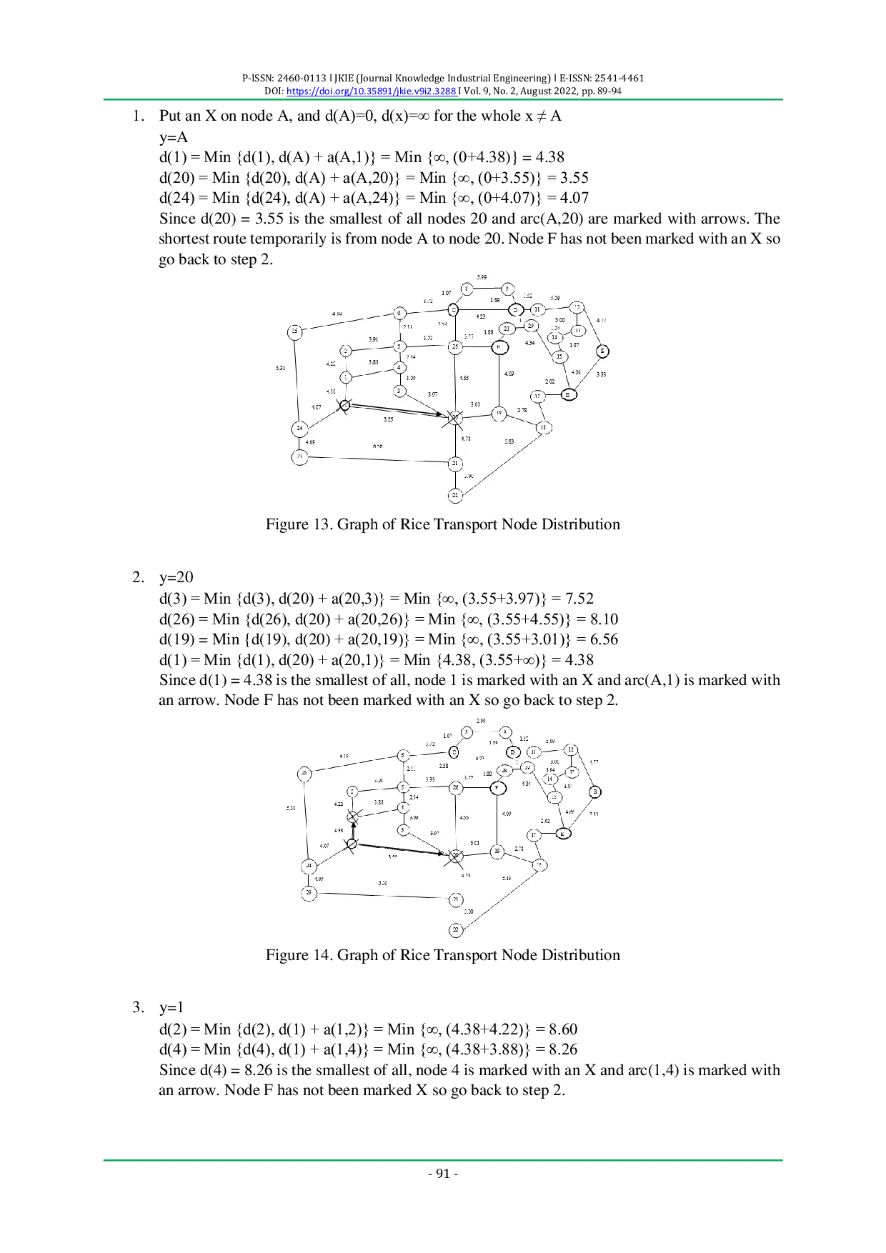 JKIE (Journal Knowledge Industrial Engineering)JKIE (Journal Knowledge Industrial Engineering)Distribusi merupakan kegiatan yang dilakukan untuk menyebarkan produk ke pasar agar konsumen dapat membelinya. Distribusi juga dapat memengaruhi harga barang, sehingga distribusi harus efektif. Penelitian ini bertujuan menentukan rute terpendek yang efektif dalam distribusi sehingga harga produk tidak tinggi dan perusahaan tidak mengalami kerugian. Metode analisis data yang digunakan adalah Algoritma Dijkstra dengan data jarak antara titik awal melalui titik‑titik yang telah ditentukan. Hasil perhitungan menunjukkan rute terpendek dan tercepat berdasarkan algoritma Dijkstra adalah: A‑20‑19‑F‑26‑C‑D‑11‑12‑B‑E dengan jarak 40,71 km. Distributor Beras Medan diharapkan memilih rute transportasi terpendek agar distribusi beras dapat dilakukan secara cepat dan optimal.
