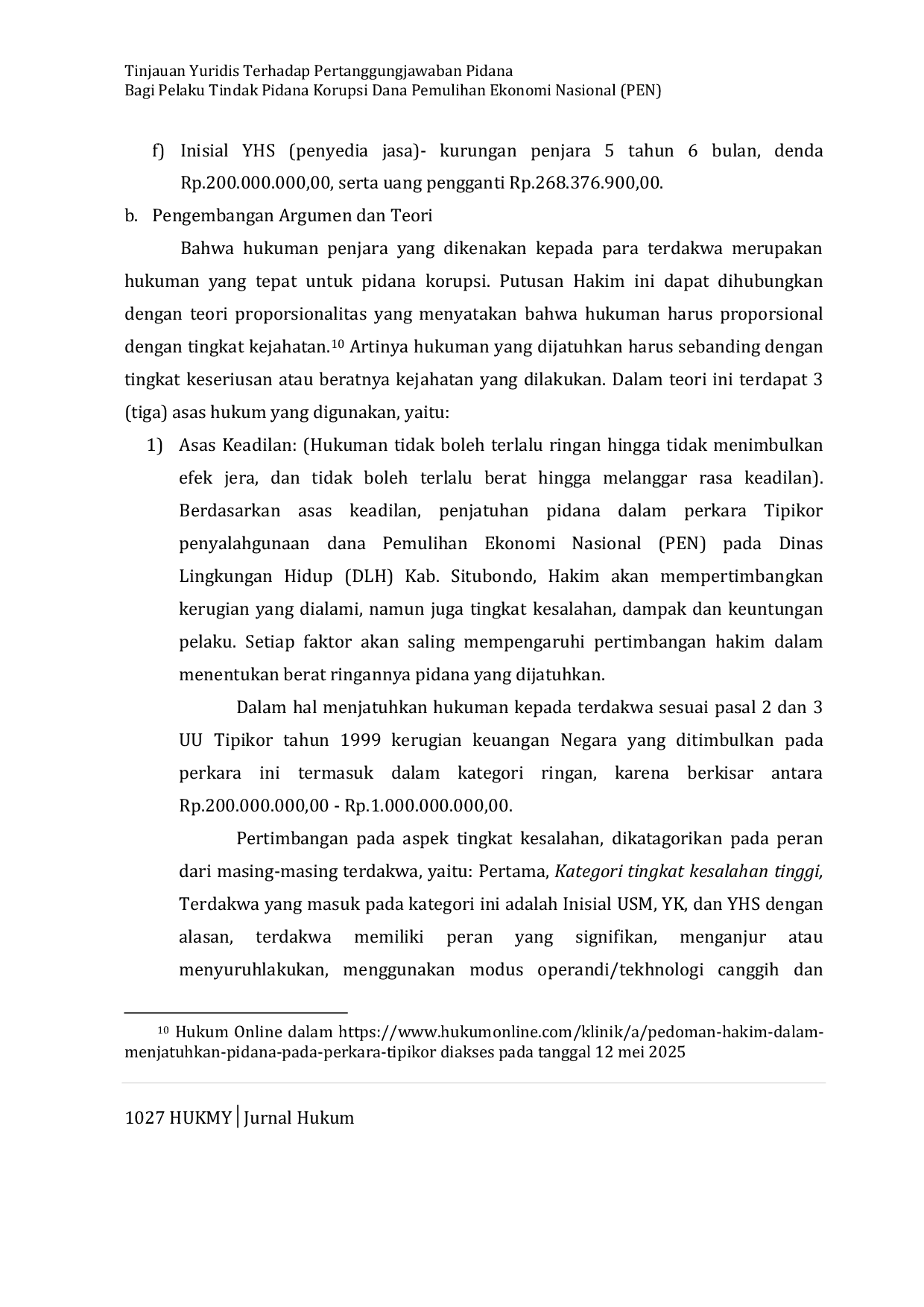 HUKMY : Jurnal HukumHUKMY : Jurnal HukumPenyalagunaan dana PEN yang terjadi di Kabupaten Situbondo mendekati angka satu Miliar Rupiah. Dana ini merupakan Dana Alokasi Umum (DAU) dalam Pengadaan Jasa Konsultasi Penyusunan Analisis Mengenai Dampak Lingkungan (AMDAL), yang terdapat UKL (Upaya Keseimbangan Lingkungan) dan UPL (Upaya Pengelolaan Lingkungan) pada Dinas Lingkungan Hidup Tahun anggaran 2021. Penelitian ini bertujuan untuk mengetahui pertanggungjawaban tindak pidana korupsi dana Pemulihan Ekonomi Nasional (PEN) Kabupaten Situbondo tahun 2021 dan hukuman penjara yang dijatuhkan, merupakan hukuman yang tepat bagi para pelaku tindak pidana korupsi. Jenis penelitian hukum ini adalah penelitian hukum yang bersifat deskriptif normatif, Penelitian hukum merupakan suatu proses untuk menemukan aturan hukum, prinsip‑prinsip hukum, maupun doktrin‑doktrin hukum guna menjawab isu hukum yang dihadapi dalam pembahasan masalah. peneliti akan mengumpulkan data tertulis dalam bentuk dokumen yang menjadi arsip atau salinan. Data pustaka merupakan sumber data sekunder, sehingga bisa menjadi penguat penelitian. Hasil dari penelitian ini, dinyatakan bahwa pada saat jangka waktu pekerjaan berakhir, kegiatan pengadaan jasa konsultasi penyusunan UKL (Upaya Keseimbangan Lingkungan)‑UPL (Upaya Pengelolaan Lingkungan) pada Dinas Lingkungan Hidup tidak selesai tepat pada waktunya. Dalam kasus ini melibatkan 4 tersangka dari dinas Lingkungan Hidup dan 2 tersangka dari pihak swasta sebagai penyedia jasa. Akibat dari tindakan korupsi yang dilakukan oleh terdakwa memiliki dampak social dan moral terhadap institusi Negara dan mencederai prinsip keadilan social. Terdakwa dijatuhi hukuman pidana berupa kurungan penjara, denda, uang pengganti, pencabutan jabatan fungsional dan perampasan asset.